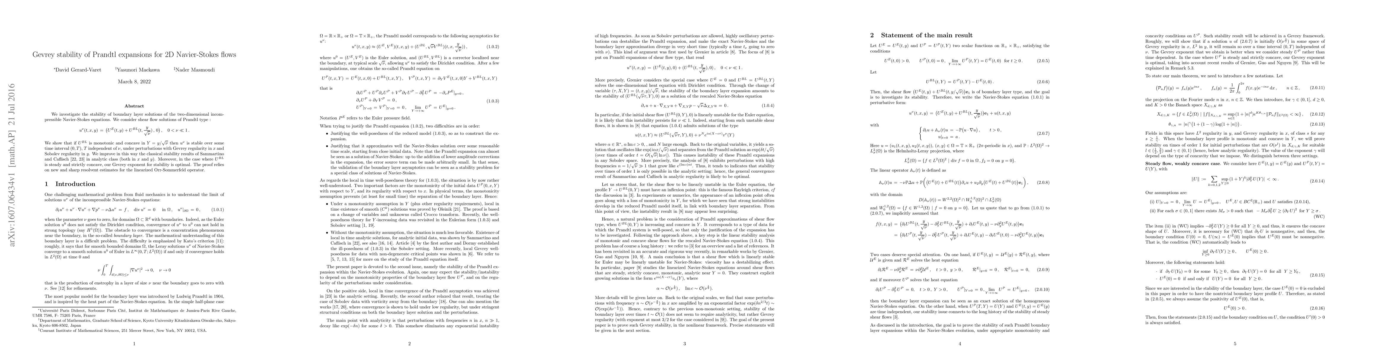 We investigate the stability of boundary layer solutions of the two-dimensional incompressible Navier-Stokes equations. We consider shear flow solutions of Prandtl type : $$ u^\nu(t,x,y) \, = \, \big (U^E(t,y) + U^{BL}(t,\frac{y}{\sqrt{\nu}})\,, \, 0 \big )\, , \quad 0<\nu \ll 1\,. $$ We show that if $U^{BL}$ is monotonic and concave in $Y = y /\sqrt{\nu}$ then $u^\nu$ is stable over some time interval $(0,T)$, $T$ independent of $\nu$, under perturbations with Gevrey regularity in $x$ and Sobolev regularity in $y$. We improve in this way the classical stability results of Sammartino and Caflisch in analytic class (both in $x$ and $y$). Moreover, in the case where $U^{BL}$ is steady and strictly concave, our Gevrey exponent for stability is optimal. The proof relies on new and sharp resolvent estimates for the linearized Orr-Sommerfeld operator.