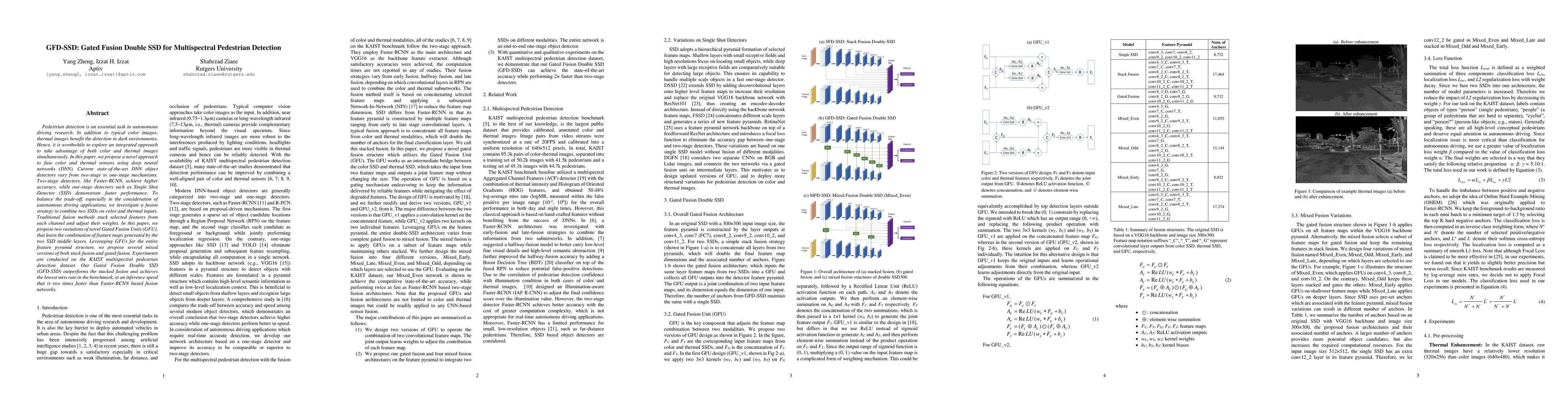 The paper proposes a Gated Fusion Double SSD (GFD-SSD) for multispectral pedestrian detection, combining color and thermal images using deep neural networks. It introduces Gated Fusion Units (GFU) to optimize feature map fusion from two SSDs, achieving better accuracy and faster inference compared to traditional fusion methods and Faster-RCNN.