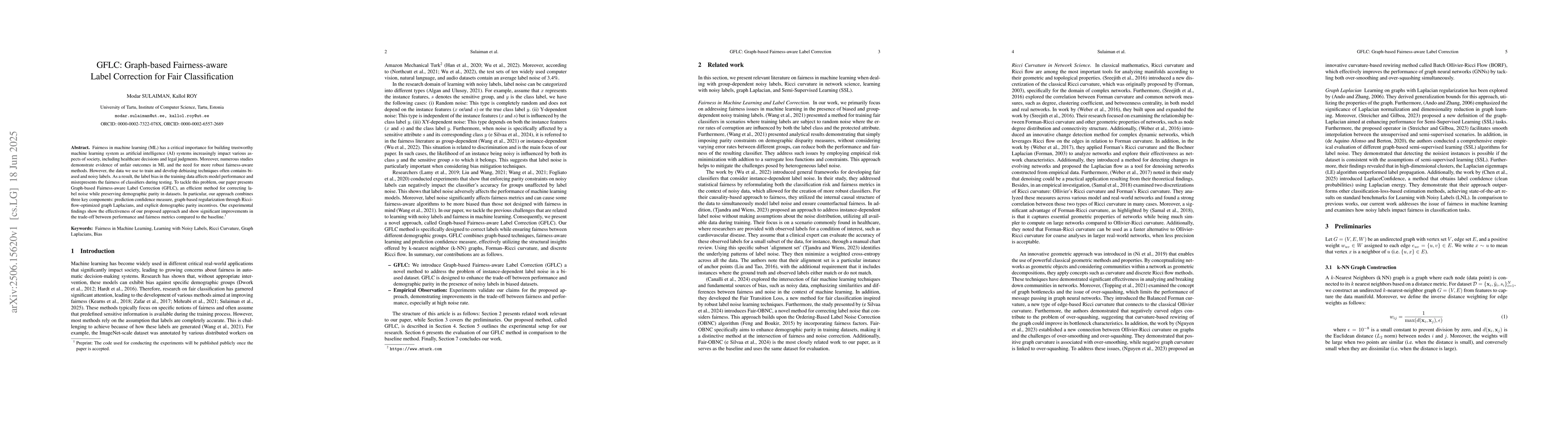 Fairness in machine learning (ML) has a critical importance for building trustworthy machine learning system as artificial intelligence (AI) systems increasingly impact various aspects of society, including healthcare decisions and legal judgments. Moreover, numerous studies demonstrate evidence of unfair outcomes in ML and the need for more robust fairness-aware methods. However, the data we use to train and develop debiasing techniques often contains biased and noisy labels. As a result, the label bias in the training data affects model performance and misrepresents the fairness of classifiers during testing. To tackle this problem, our paper presents Graph-based Fairness-aware Label Correction (GFLC), an efficient method for correcting label noise while preserving demographic parity in datasets. In particular, our approach combines three key components: prediction confidence measure, graph-based regularization through Ricci-flow-optimized graph Laplacians, and explicit demographic parity incentives. Our experimental findings show the effectiveness of our proposed approach and show significant improvements in the trade-off between performance and fairness metrics compared to the baseline.