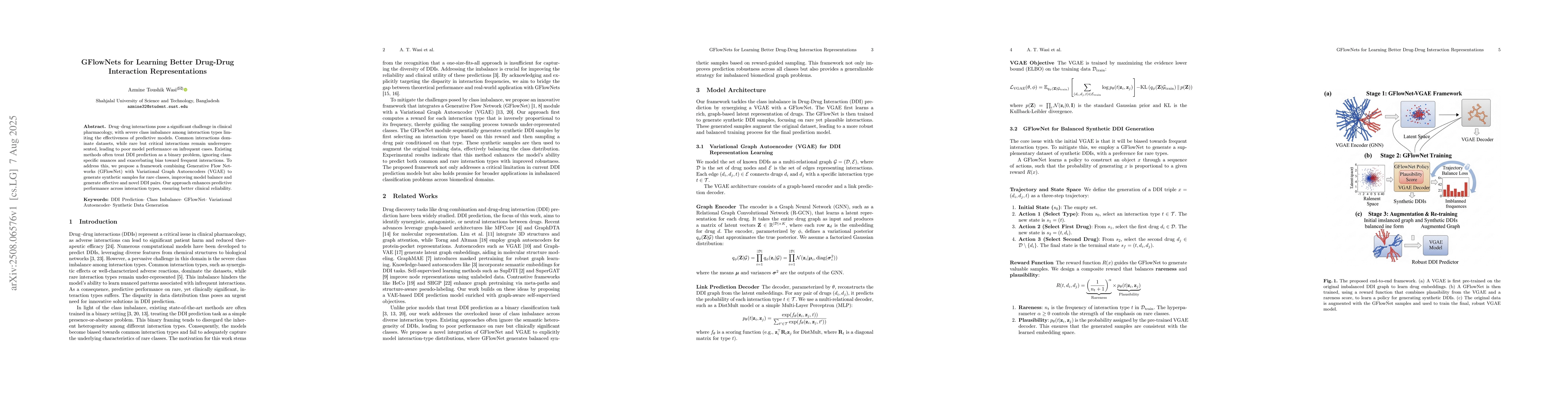 Drug-drug interactions pose a significant challenge in clinical pharmacology, with severe class imbalance among interaction types limiting the effectiveness of predictive models. Common interactions dominate datasets, while rare but critical interactions remain underrepresented, leading to poor model performance on infrequent cases. Existing methods often treat DDI prediction as a binary problem, ignoring class-specific nuances and exacerbating bias toward frequent interactions. To address this, we propose a framework combining Generative Flow Networks (GFlowNet) with Variational Graph Autoencoders (VGAE) to generate synthetic samples for rare classes, improving model balance and generate effective and novel DDI pairs. Our approach enhances predictive performance across interaction types, ensuring better clinical reliability.