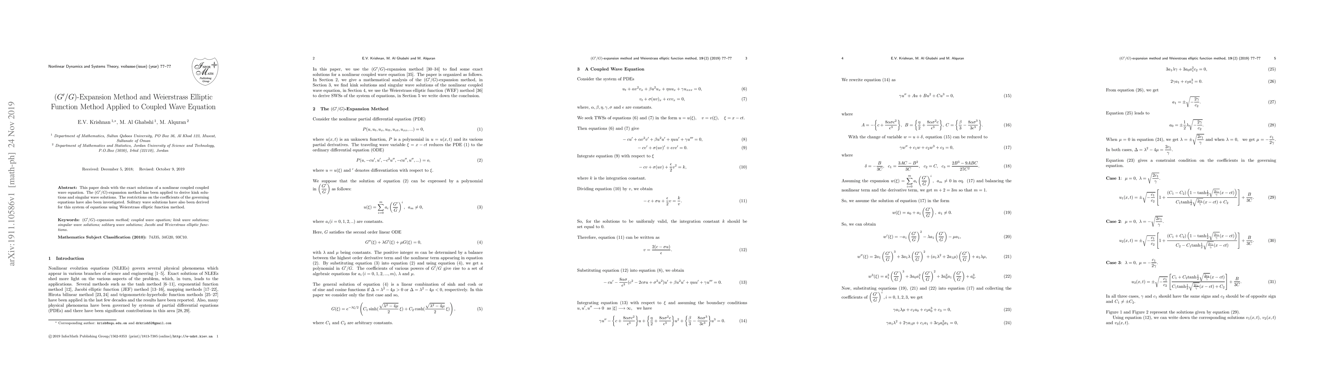 This paper applies the (G'/G)-expansion method to derive kink and singular wave solutions for a nonlinear coupled wave equation, while also exploring the associated coefficient restrictions. Additionally, the Weierstrass elliptic function method is used to obtain solitary wave solutions for the same system.