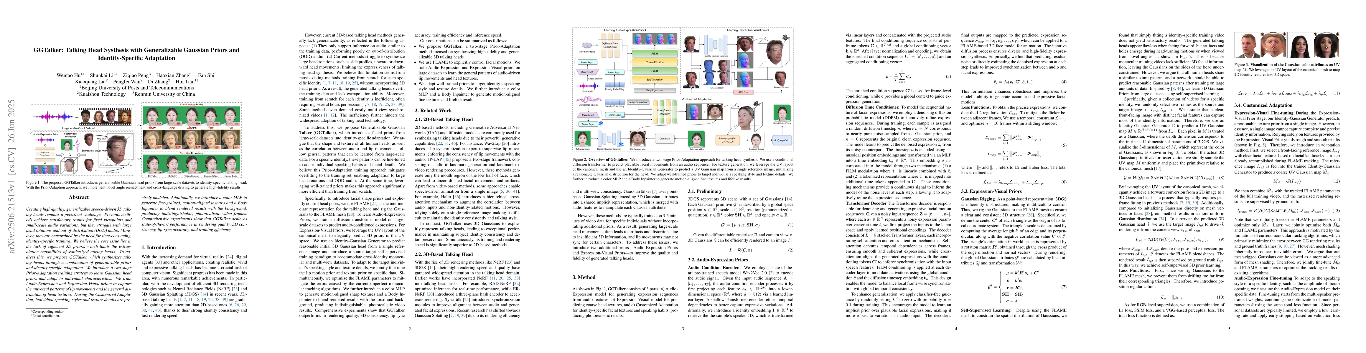 The paper introduces GGTalker, a two-stage training framework combining generalizable Gaussian priors with identity-specific adaptation, utilizing diffusion models, 3D Gaussian head priors, and a color MLP for realistic talking head synthesis.