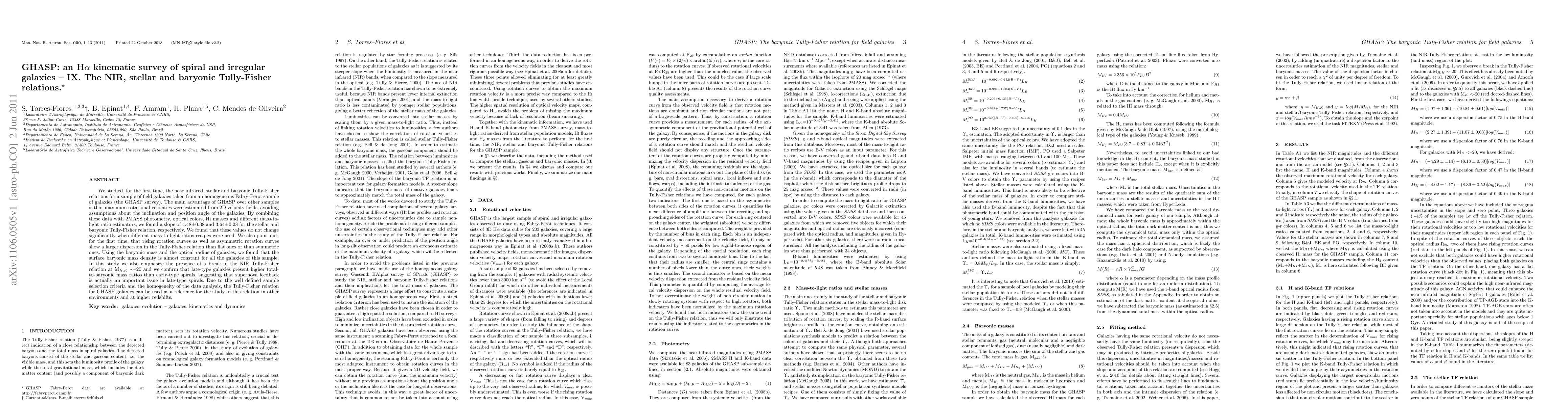 We studied, for the first time, the near infrared, stellar and baryonic Tully-Fisher relations for a sample of field galaxies taken from an homogeneous Fabry-Perot sample of galaxies (the GHASP survey). The main advantage of GHASP over other samples is that maximum rotational velocities were estimated from 2D velocity fields, avoiding assumptions about the inclination and position angle of the galaxies. By combining these data with 2MASS photometry, optical colors, HI masses and different mass-to-light ratio estimators, we found a slope of 4.48\pm0.38 and 3.64\pm0.28 for the stellar and baryonic Tully-Fisher relation, respectively. We found that these values do not change significantly when different mass-to-light ratios recipes were used. We also point out, for the first time, that rising rotation curves as well as asymmetric rotation curves show a larger dispersion in the Tully-Fisher relation than flat ones or than symmetric ones. Using the baryonic mass and the optical radius of galaxies, we found that the surface baryonic mass density is almost constant for all the galaxies of this sample. In this study we also emphasize the presence of a break in the NIR Tully-Fisher relation at M(H,K)\sim-20 and we confirm that late-type galaxies present higher total-to-baryonic mass ratios than early-type spirals, suggesting that supernova feedback is actually an important issue in late-type spirals. Due to the well defined sample selection criteria and the homogeneity of the data analysis, the Tully-Fisher relation for GHASP galaxies can be used as a reference for the study of this relation in other environments and at higher redshifts.
