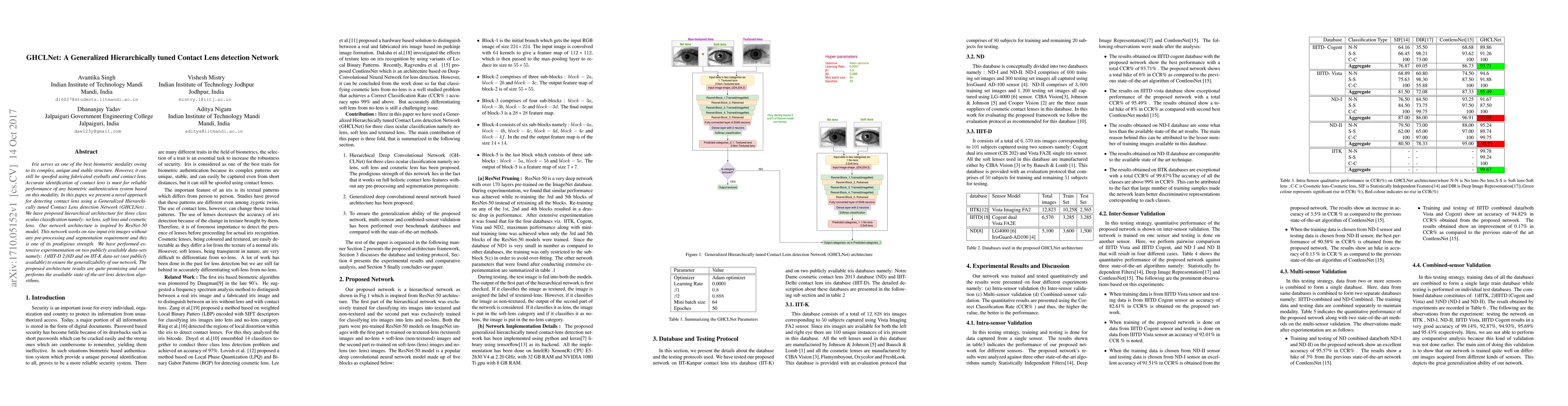 Iris serves as one of the best biometric modality owing to its complex, unique and stable structure. However, it can still be spoofed using fabricated eyeballs and contact lens. Accurate identification of contact lens is must for reliable performance of any biometric authentication system based on this modality. In this paper, we present a novel approach for detecting contact lens using a Generalized Hierarchically tuned Contact Lens detection Network (GHCLNet) . We have proposed hierarchical architecture for three class oculus classification namely: no lens, soft lens and cosmetic lens. Our network architecture is inspired by ResNet-50 model. This network works on raw input iris images without any pre-processing and segmentation requirement and this is one of its prodigious strength. We have performed extensive experimentation on two publicly available data-sets namely: 1)IIIT-D 2)ND and on IIT-K data-set (not publicly available) to ensure the generalizability of our network. The proposed architecture results are quite promising and outperforms the available state-of-the-art lens detection algorithms.