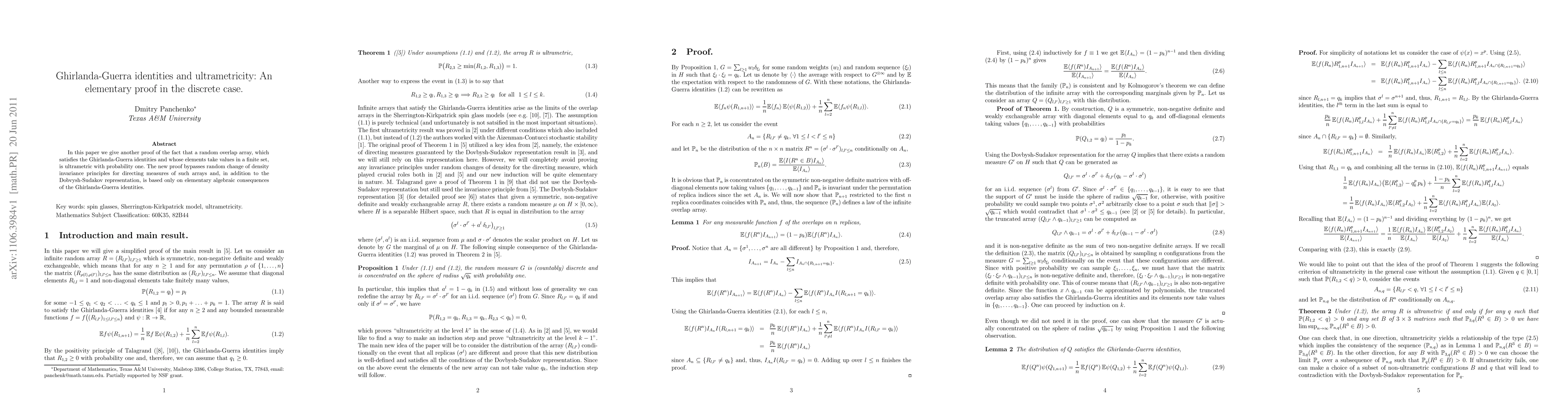 In this paper we give another proof of the fact that a random overlap array, which satisfies the Ghirlanda-Guerra identities and whose elements take values in a finite set, is ultrametric with probability one. The new proof bypasses random change of density invariance principles for directing measures of such arrays and, in addition to the Dobvysh-Sudakov representation, is based only on elementary algebraic consequences of the Ghirlanda-Guerra identities.