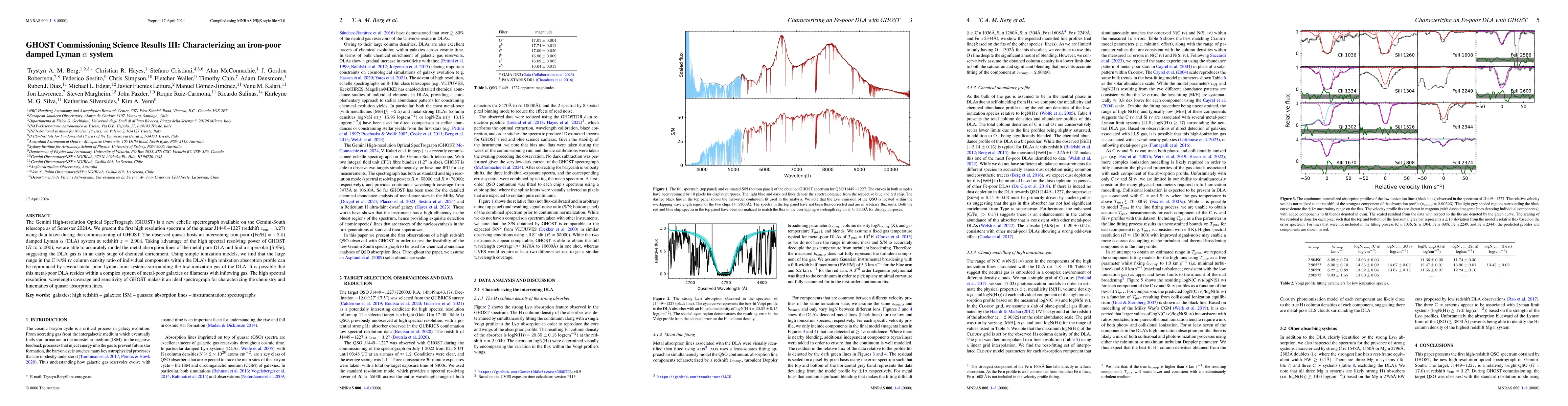 The GHOST spectrograph on the Gemini-South telescope captured the first high-resolution spectrum of quasar J1449-1227, revealing an iron-poor damped Lyman α system at redshift z=2.904. The analysis suggests the gas is in an early chemical enrichment stage, with a supersolar [Si/Fe] ratio, indicating potential membership in a complex of metal-poor galaxies or filaments.