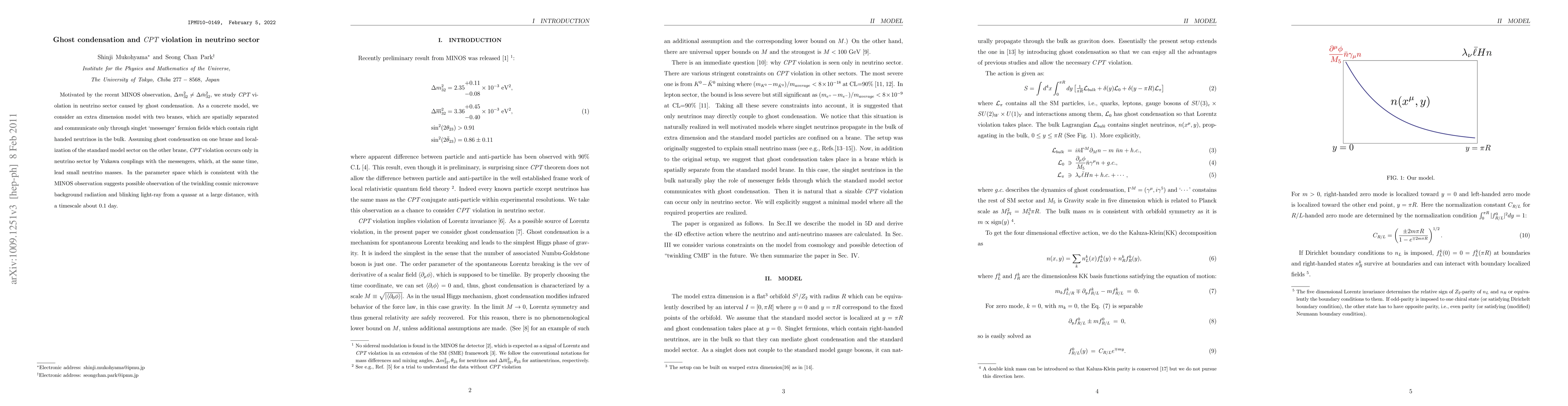 We consider CPT violation in neutrino sector, which is induced by ghost condensation. A model with extra dimension is suggested where ghost condensation occurs at a distant location separated from the SM brane. Right handed neutrinos in the bulk, which are originally introduced to explain small Yukawa couplings, play the role of messenger fields communicating ghost condensation and the standard model sector and lead to a sizable CPT violation in neutrino sector at the leading order. The model provides a resolution to the recent MINOS anomaly without spoiling any experimental constraints and may be able to be tested by observing an interesting phenomenon, twinkling cosmic microwave background radiation, with timescale about O(10-100) minutes at future CMB observations e.g. Planck.