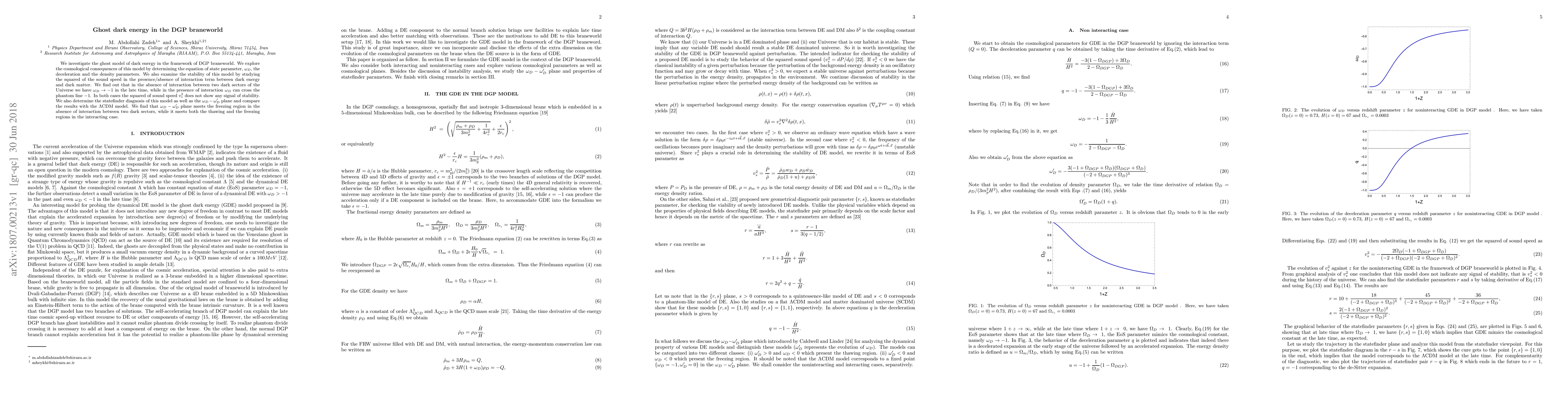We investigate the ghost model of dark energy in the framework of DGP braneworld. We explore the cosmological consequences of this model by determining the equation of state parameter, $\omega_D$, the deceleration and the density parameters. We also examine the stability of this model by studying the squared of the sound speed in the presence/absence of interaction term between dark energy and dark matter. We find out that in the absence of interaction between two dark sectors of the Universe we have $\omega_D\rightarrow -1$ in the late time, while in the presence of interaction $\omega_D$ can cross the phantom line $-1$. In both cases the squared of sound speed $v_s^2$ does not show any signal of stability. We also determine the statefinder diagnosis of this model as well as the $\omega_D-{\omega}^{\prime}_{D}$ plane and compare the results with the $\Lambda$CDM model. We find that $\omega_D-{\omega}^{\prime}_{D}$ plane meets the freezing region in the absence of interaction between two dark sectors, while it meets both the thawing and the freezing regions in the interacting case.