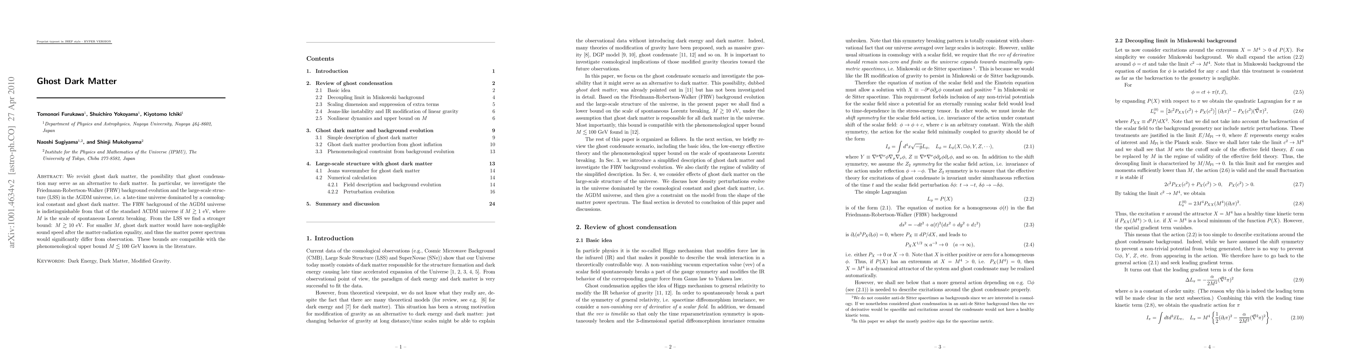 We revisit ghost dark matter, the possibility that ghost condensation may serve as an alternative to dark matter. In particular, we investigate the Friedmann-Robertson-Walker (FRW) background evolution and the large-scale structure (LSS) in the $\Lambda$GDM universe, i.e. a late-time universe dominated by a cosmological constant and ghost dark matter. The FRW background of the $\Lambda$GDM universe is indistinguishable from that of the standard $\Lambda$CDM universe if $M\gtrsim 1 {\rm eV}$, where $M$ is the scale of spontaneous Lorentz breaking. From the LSS we find a stronger bound: $M\gtrsim 10 {\rm eV}$. For smaller $M$, ghost dark matter would have non-negligible sound speed after the matter-radiation equality, and thus the matter power spectrum would significantly differ from observation. These bounds are compatible with the phenomenological upper bound $M\lesssim 100 {\rm GeV}$ known in the literature.