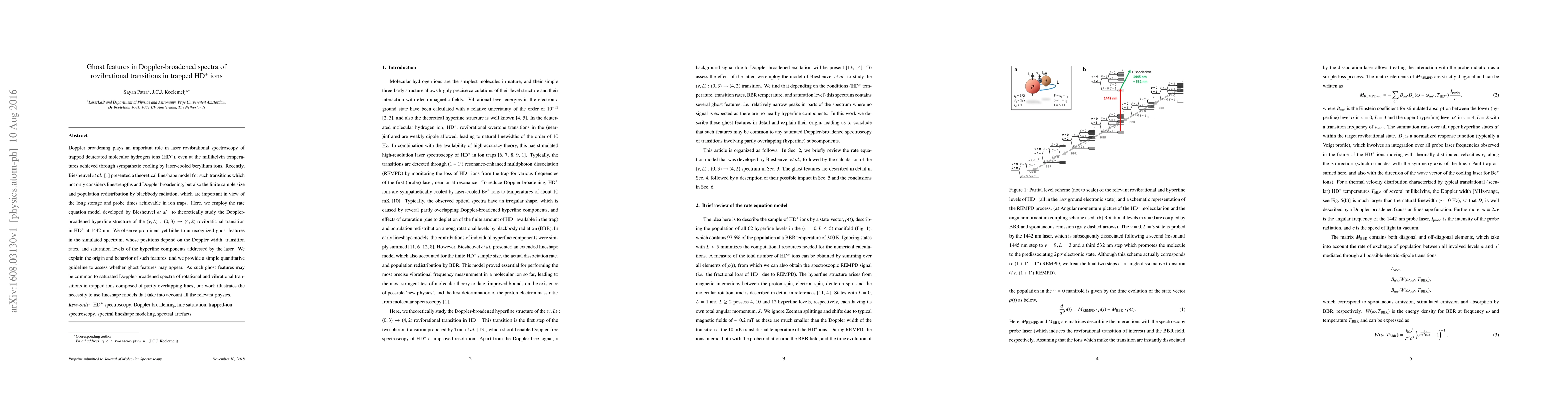 Doppler broadening plays an important role in laser rovibrational spectroscopy of trapped deuterated molecular hydrogen ions (HD$^+$), even at the millikelvin temperatures achieved through sympathetic cooling by laser-cooled beryllium ions. Recently, Biesheuvel \textit{et al.} \cite{Biesheuvel2016} presented a theoretical lineshape model for such transitions which not only considers linestrengths and Doppler broadening, but also the finite sample size and population redistribution by blackbody radiation, which are important in view of the long storage and probe times achievable in ion traps. Here, we employ the rate equation model developed by Biesheuvel \textit{et al.} to theoretically study the Doppler-broadened hyperfine structure of the $(v,L):(0,3)\rightarrow(4,2)$ rovibrational transition in HD$^+$ at 1442~nm. We observe prominent yet hitherto unrecognized ghost features in the simulated spectrum, whose positions depend on the Doppler width, transition rates, and saturation levels of the hyperfine components addressed by the laser. We explain the origin and behavior of such features, and we provide a simple quantitative guideline to assess whether ghost features may appear. As such ghost features may be common to saturated Doppler-broadened spectra of rotational and vibrational transitions in trapped ions composed of partly overlapping lines, our work illustrates the necessity to use lineshape models that take into account all the relevant physics.