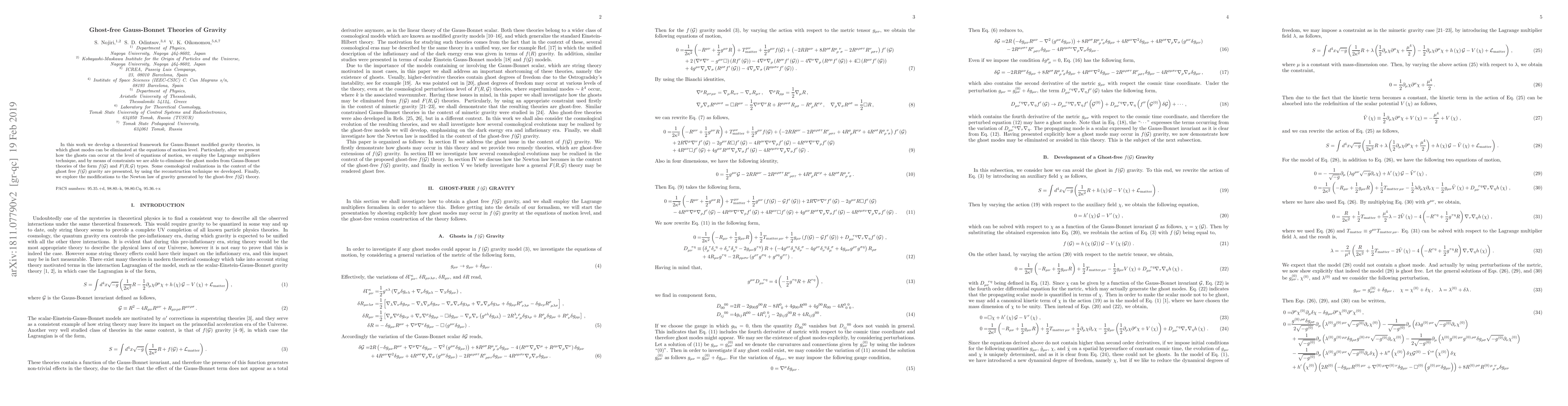 This paper develops a theoretical framework for ghost-free Gauss-Bonnet modified gravity theories, eliminating ghost modes using Lagrange multipliers and constraints. It also presents cosmological applications and modifications to Newton's law of gravity in the context of ghost-free $f(\mathcal{G})$ gravity.