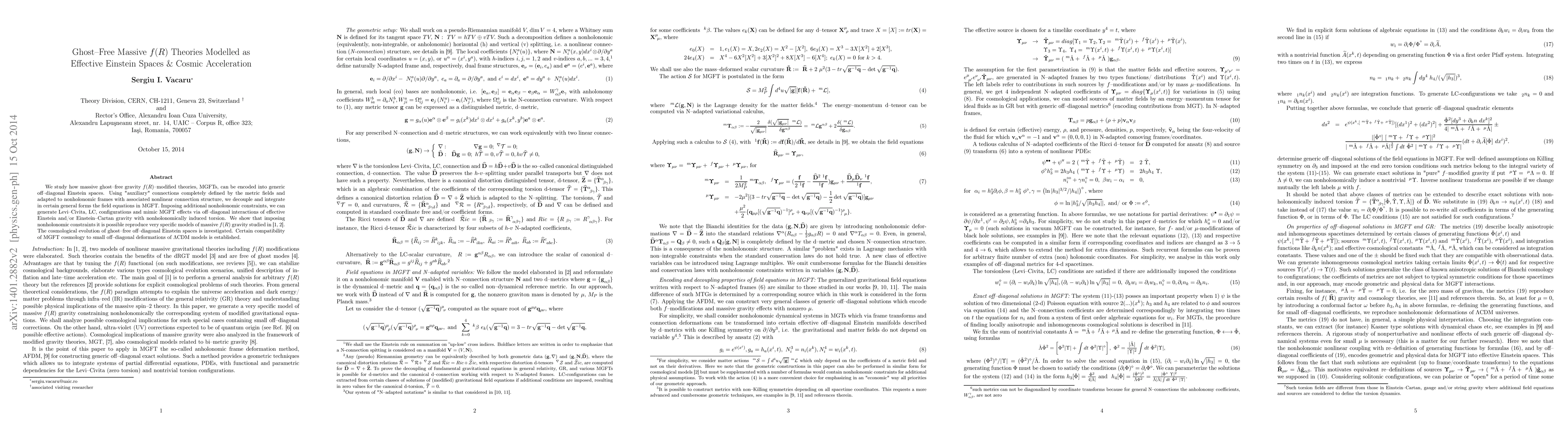 This paper explores how massive ghost-free $f(R)$ gravity theories can be modeled using effective Einstein spaces with off-diagonal metrics and nonholonomic constraints. It demonstrates that these models can reproduce specific massive $f(R)$ gravity effects and investigate their cosmological implications, showing compatibility with small modifications to $\Lambda$CDM models.