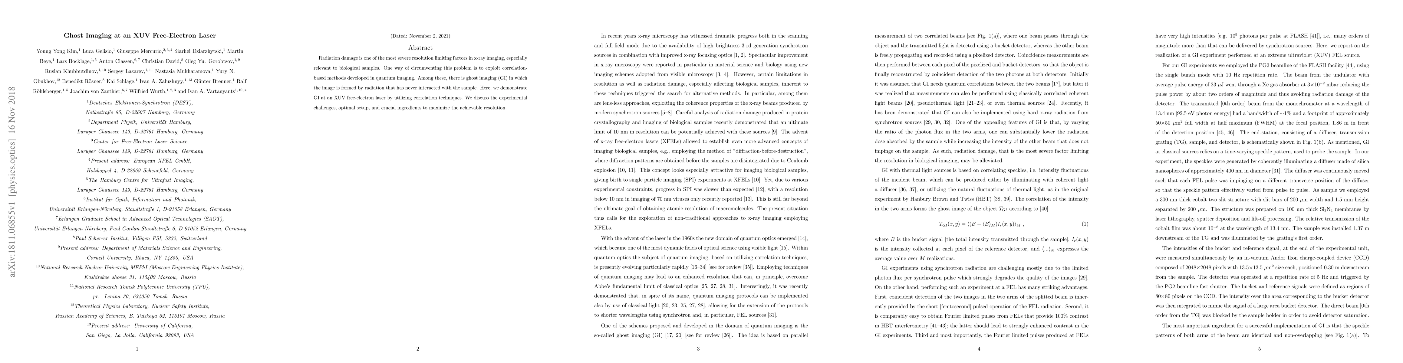 This paper demonstrates the application of ghost imaging (GI) at an XUV free-electron laser to overcome radiation damage in x-ray imaging, particularly for biological samples. The study highlights the experimental setup and challenges to achieve optimal resolution through correlation-based methods.