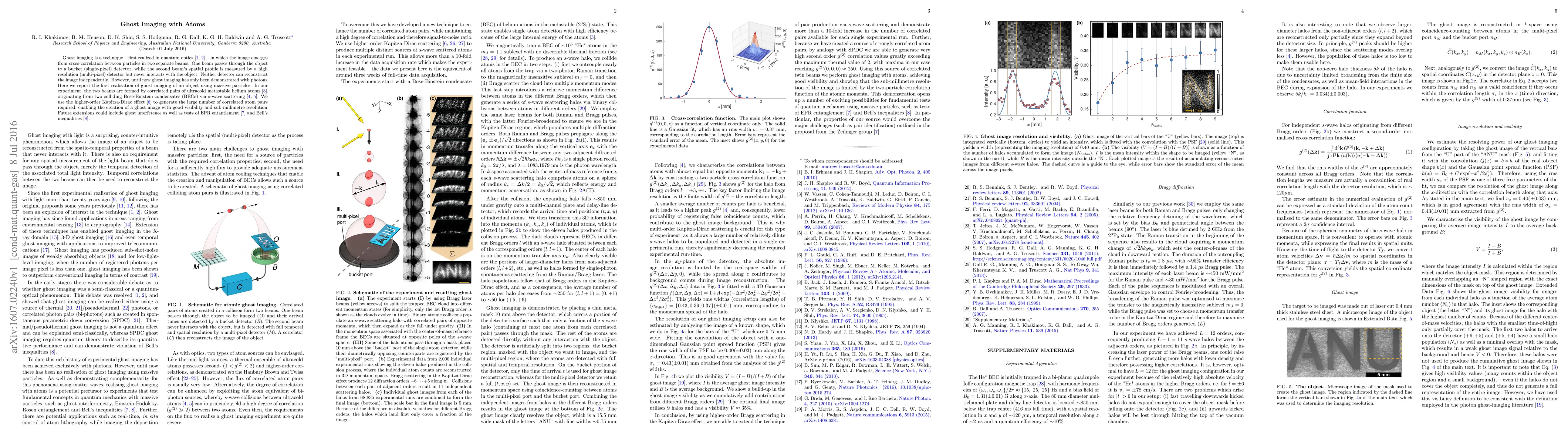 This paper reports the first successful implementation of ghost imaging using massive particles, specifically ultracold metastable helium atoms, instead of photons. The experiment utilizes correlated atom pairs from colliding Bose-Einstein condensates and achieves a ghost image with good visibility and sub-millimetre resolution, opening avenues for future studies in ghost interference and quantum entanglement tests.