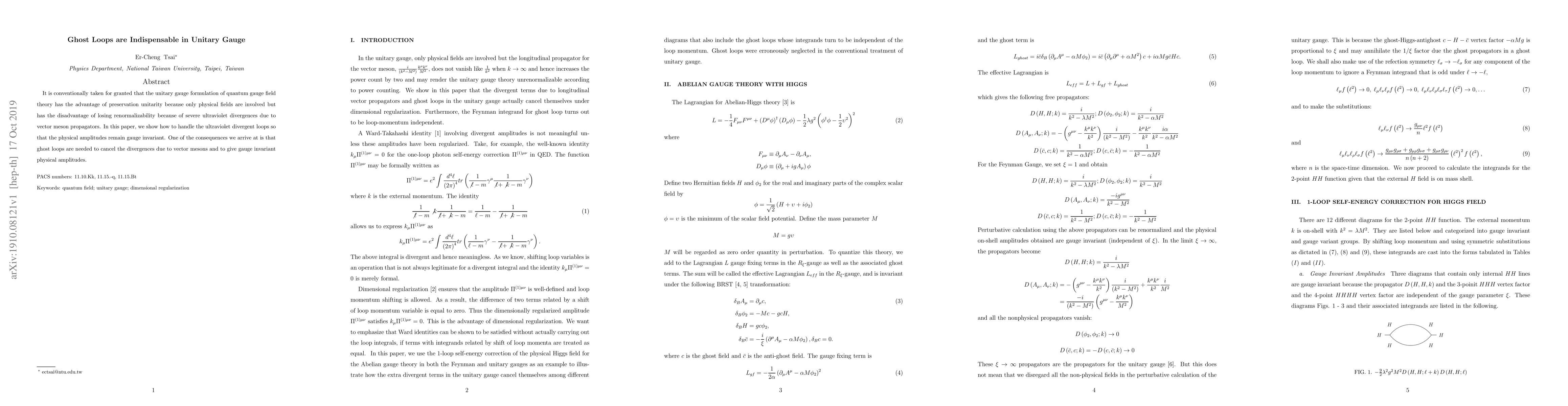 This paper demonstrates that ghost loops are essential in the unitary gauge to cancel ultraviolet divergences from vector meson propagators, ensuring gauge invariance and preserving unitarity in quantum gauge field theory.