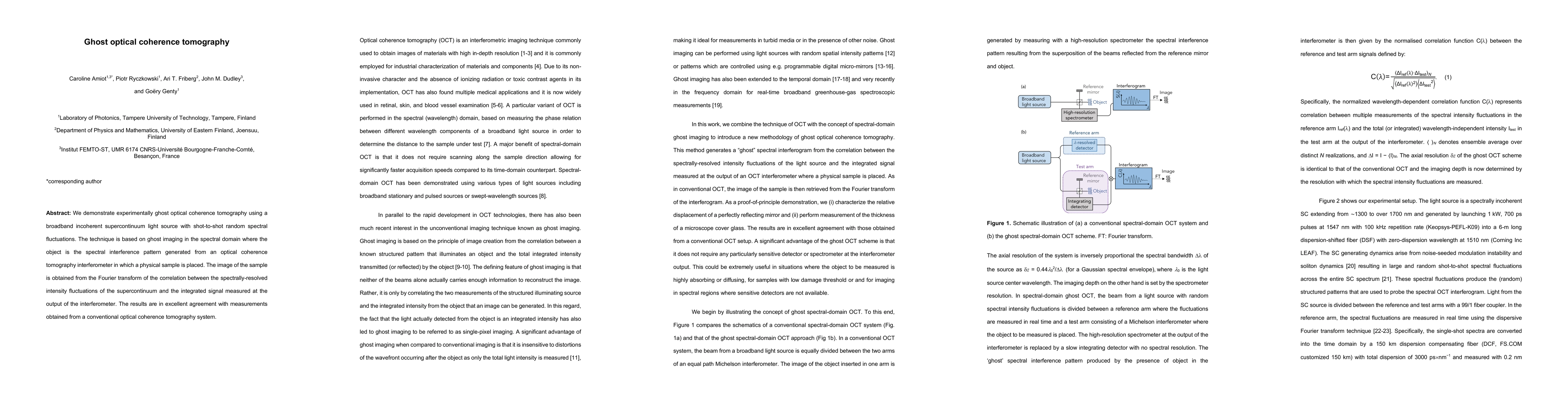 The paper demonstrates ghost optical coherence tomography using a supercontinuum light source, achieving image reconstruction through spectral interference pattern analysis and correlation with intensity fluctuations. Results match those from conventional optical coherence tomography systems.