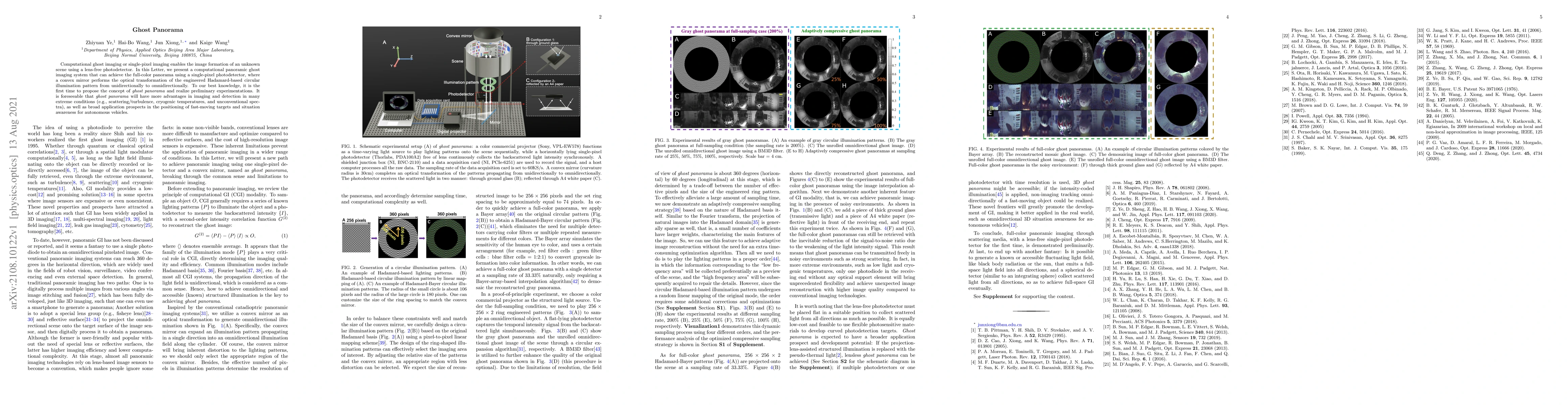 This paper introduces a novel computational panoramic ghost imaging system that uses a single-pixel photodetector to create full-color panoramas without a lens. The system employs a convex mirror to transform Hadamard-based circular illumination patterns, marking the first realization of the concept of ghost panorama.