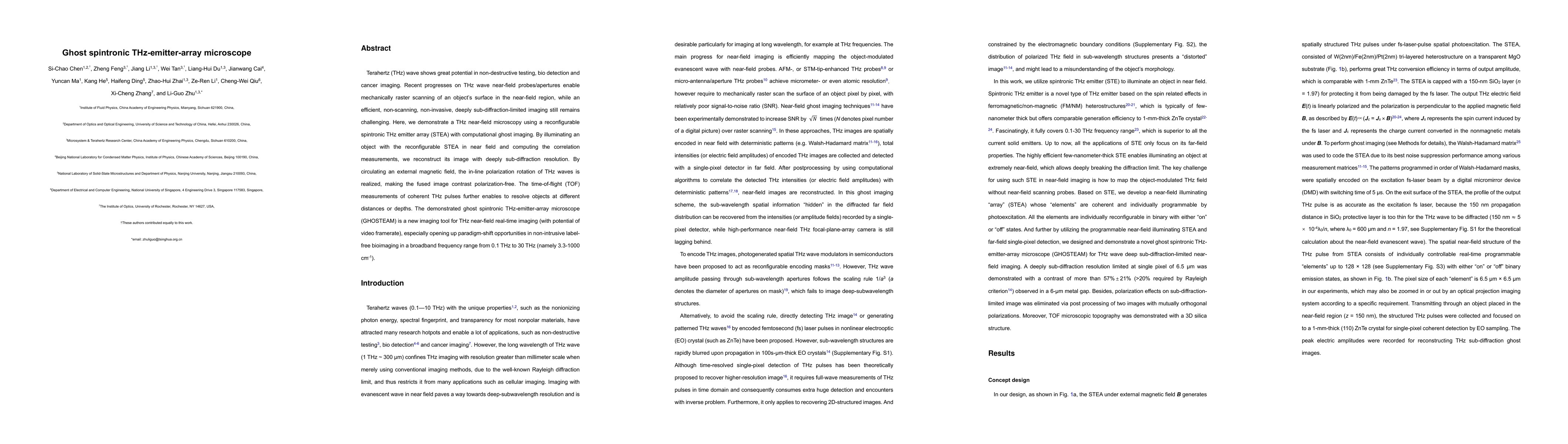 This paper presents a novel THz near-field microscopy using a reconfigurable spintronic THz emitter array (STEA) with computational ghost imaging to achieve deeply sub-diffraction-limited imaging without scanning. The method enables non-invasive, real-time imaging with potential applications in non-destructive testing and label-free bioimaging across a broad THz frequency range.