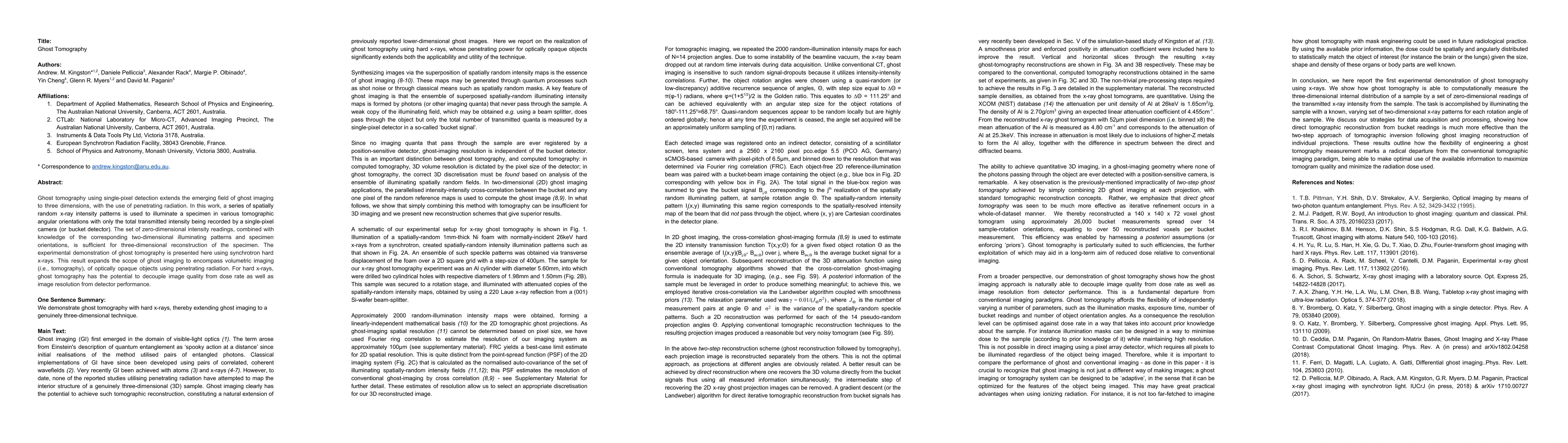Ghost tomography utilizes single-pixel detection and random x-ray patterns to achieve three-dimensional reconstruction of opaque specimens via penetrating radiation. This method decouples image quality and resolution from detector performance and dose rate.