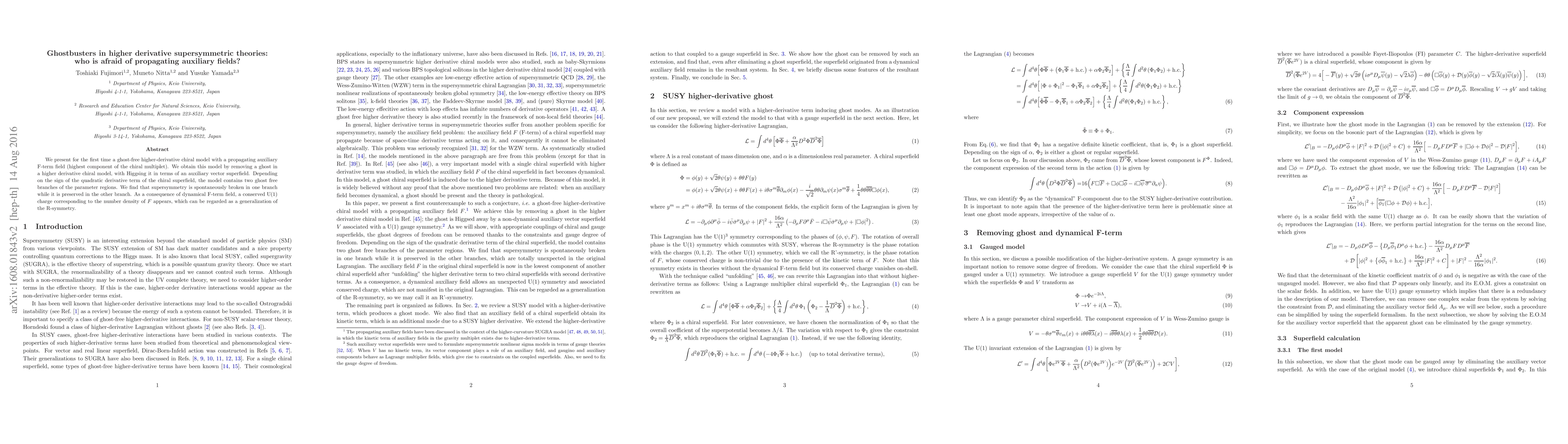 This paper introduces a ghost-free higher-derivative chiral model featuring a propagating auxiliary F-term field, achieved by removing a ghost from a higher derivative chiral model. The model exhibits two ghost-free branches with differing supersymmetry states, and includes a conserved U(1) charge linked to the F-term field, extending the concept of R-symmetry.