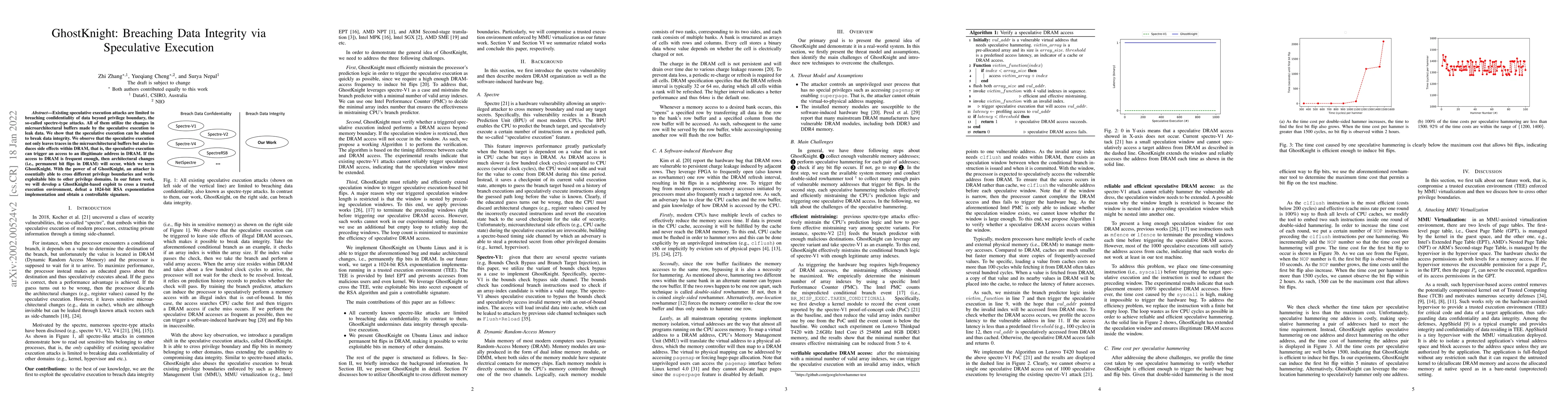 The paper introduces GhostKnight, a novel speculative execution attack that breaches data integrity by inducing side effects in DRAM, leading to permanent bit flips. Unlike previous attacks, GhostKnight can cross privilege boundaries and manipulate data in other domains, with potential future applications in defeating secure execution environments and cryptographic implementations.