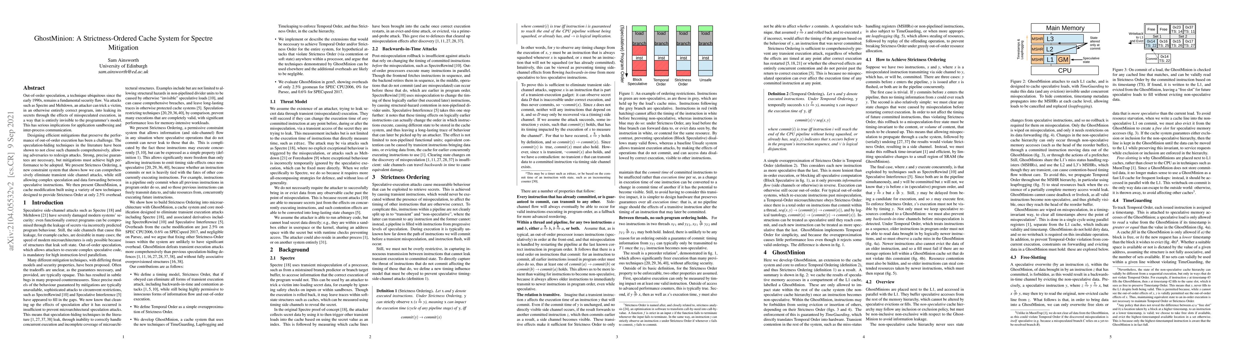 GhostMinion presents a cache system leveraging Strictness Ordering to mitigate Spectre attacks effectively while maintaining a minimal 2.5% performance overhead, addressing the challenge of preserving out-of-order execution efficiency in the face of side-channel vulnerabilities.