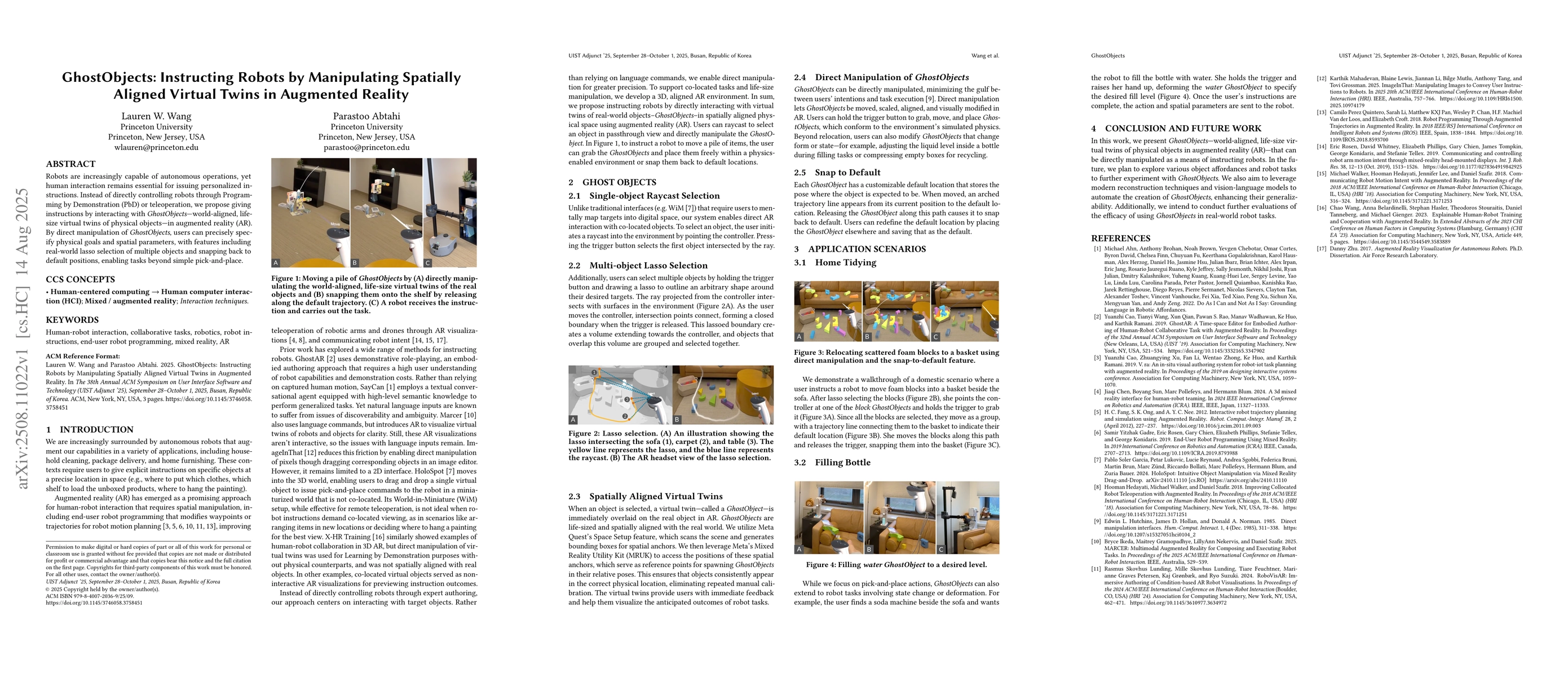 Robots are increasingly capable of autonomous operations, yet human interaction remains essential for issuing personalized instructions. Instead of directly controlling robots through Programming by Demonstration (PbD) or teleoperation, we propose giving instructions by interacting with GhostObjects-world-aligned, life-size virtual twins of physical objects-in augmented reality (AR). By direct manipulation of GhostObjects, users can precisely specify physical goals and spatial parameters, with features including real-world lasso selection of multiple objects and snapping back to default positions, enabling tasks beyond simple pick-and-place.