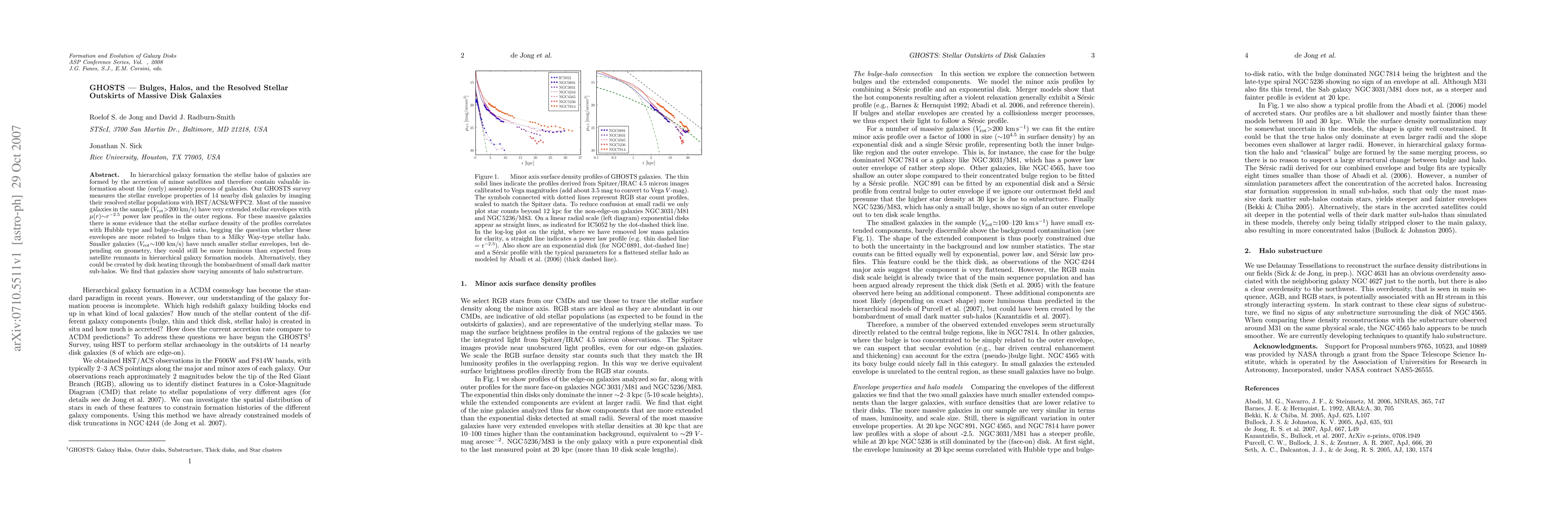 The GHOSTS survey investigates the stellar envelopes of 14 massive disk galaxies, revealing that most have extended stellar halos correlating with Hubble type and bulge-to-disk ratio, suggesting a link to bulges rather than typical Milky Way halos. Smaller galaxies exhibit smaller but potentially luminous stellar envelopes, possibly due to disk heating or satellite accretion.