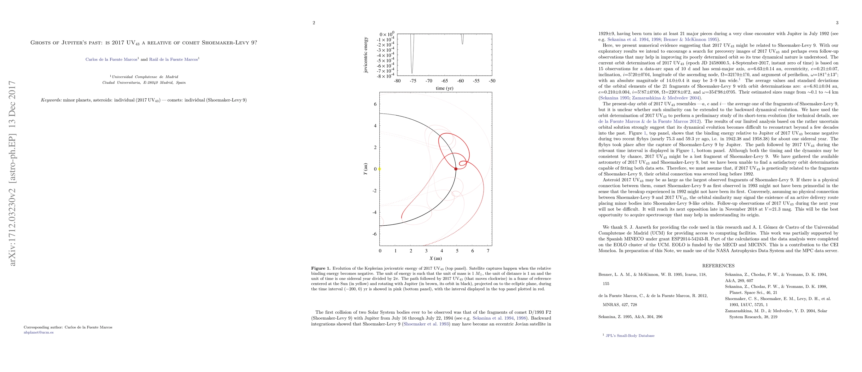 This paper suggests that 2017 UV43 may be a remnant of comet Shoemaker-Levy 9 based on similar orbital characteristics. The authors propose further observations to better determine UV43's orbit and confirm its potential relation to the historic comet.