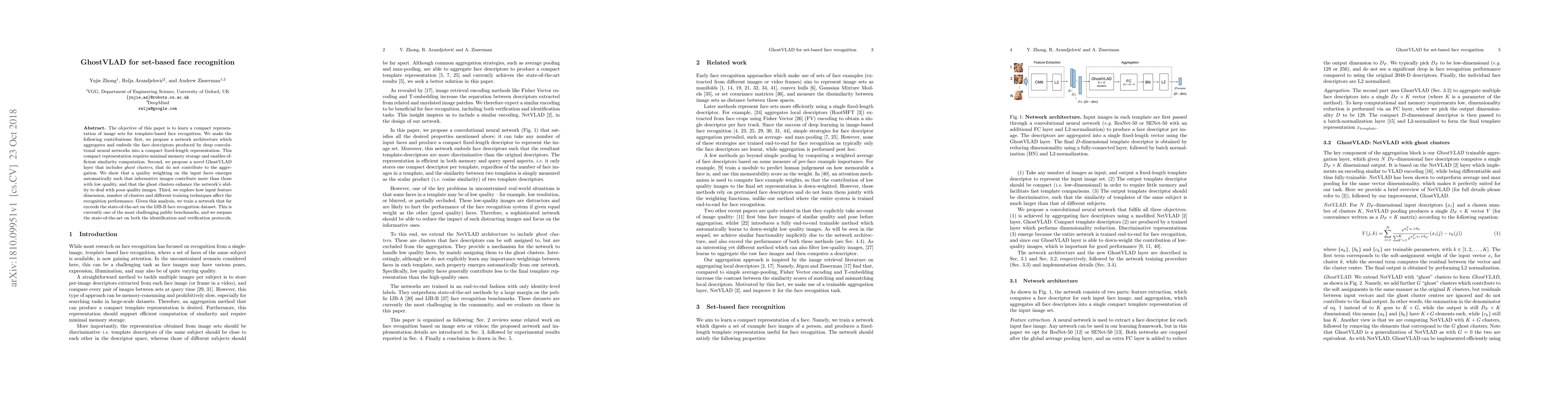 This paper proposes a GhostVLAD network architecture for set-based face recognition, embedding face descriptors into a compact representation for efficient similarity computation. It introduces a GhostVLAD layer with ghost clusters to enhance the network's robustness to poor quality images, achieving state-of-the-art results on the IJB-B dataset.