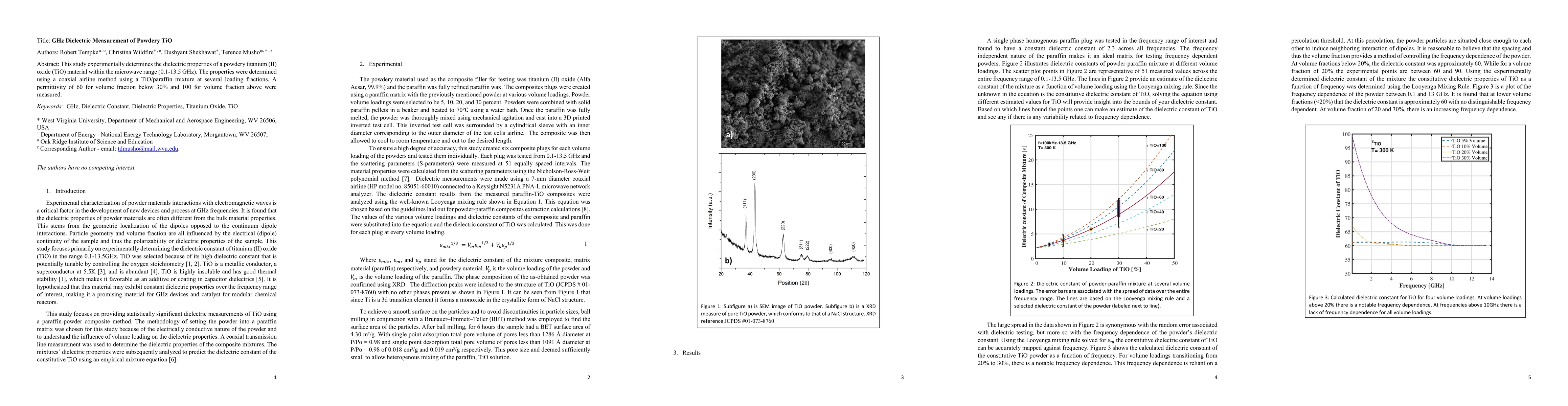 This study measures the dielectric properties of powdery titanium (II) oxide (TiO) in the GHz range using a coaxial airline method, finding permittivity values of 60 for volume fractions below 30% and 100 for those above.