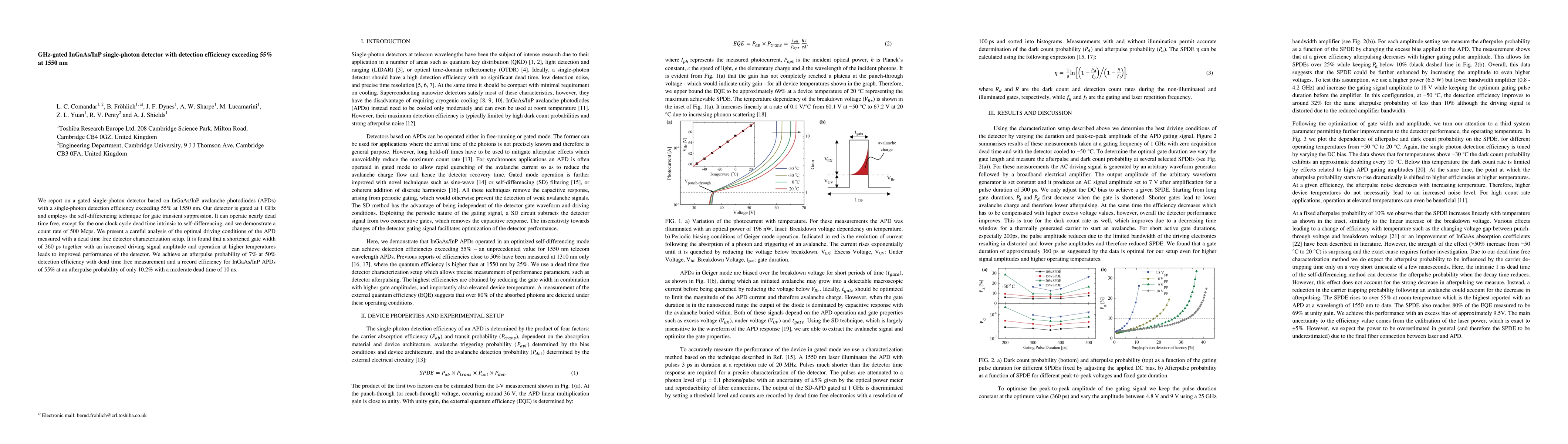 This research presents a GHz-gated InGaAs/InP single-photon detector with over 55% efficiency at 1550 nm, utilizing an InGaAs/InP avalanche photodiode (APD) and achieving nearly dead time-free operation with a count rate of 500 Mcps. The optimal performance is attained with a 360 ps gate width and higher driving amplitude, resulting in a low afterpulse probability of 7% at 50% efficiency.