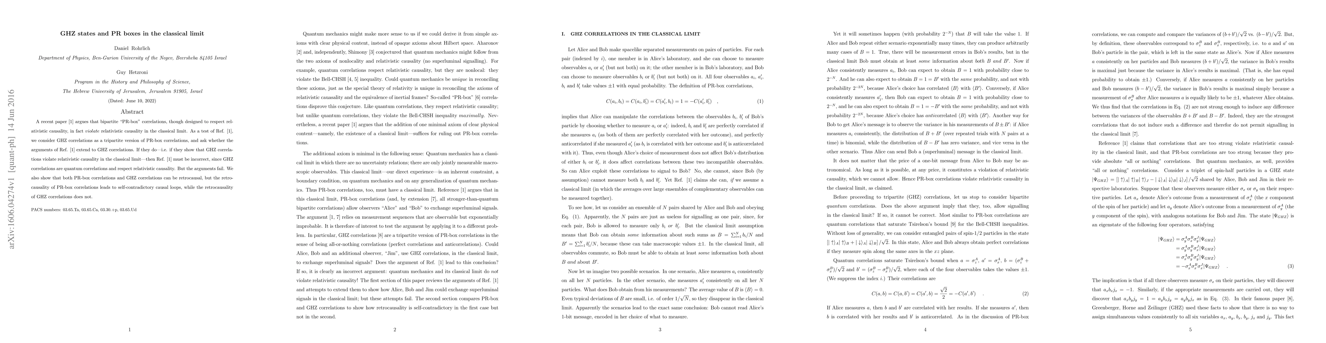 A recent paper [1] argues that bipartite "PR-box" correlations, though designed to respect relativistic causality, in fact violate relativistic causality in the classical limit. As a test of Ref. [1], we consider GHZ correlations as a tripartite version of PR-box correlations, and ask whether the arguments of Ref. [1] extend to GHZ correlations. If they do - i.e. if they show that GHZ correlations violate relativistic causality in the classical limit - then Ref. [1] must be incorrect, since GHZ correlations are quantum correlations and respect relativistic causality. But the arguments fail. We also show that both PR-box correlations and GHZ correlations can be retrocausal, but the retrocausality of PR-box correlations leads to self-contradictory causal loops, while the retrocausality of GHZ correlations does not.