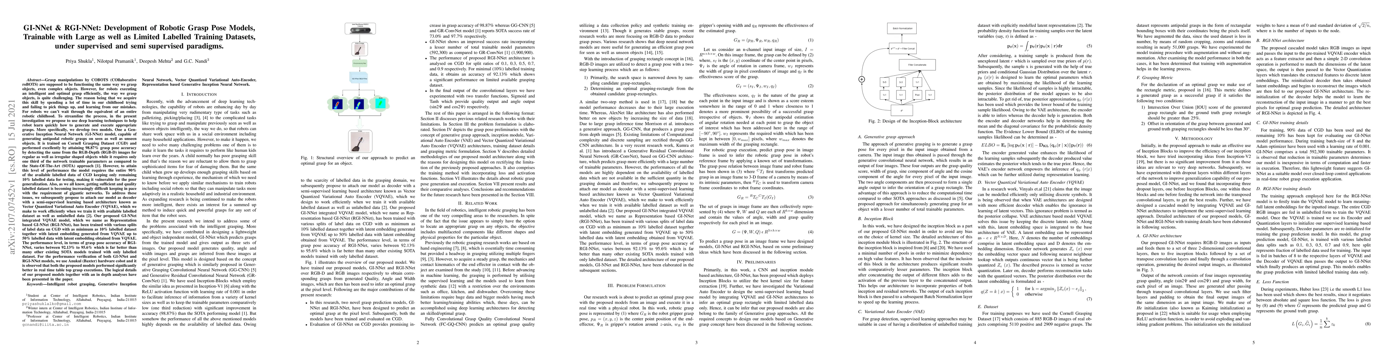 Our way of grasping objects is challenging for efficient, intelligent and optimal grasp by COBOTs. To streamline the process, here we use deep learning techniques to help robots learn to generate and execute appropriate grasps quickly. We developed a Generative Inception Neural Network (GI-NNet) model, capable of generating antipodal robotic grasps on seen as well as unseen objects. It is trained on Cornell Grasping Dataset (CGD) and attained 98.87% grasp pose accuracy for detecting both regular and irregular shaped objects from RGB-Depth (RGB-D) images while requiring only one third of the network trainable parameters as compared to the existing approaches. However, to attain this level of performance the model requires the entire 90% of the available labelled data of CGD keeping only 10% labelled data for testing which makes it vulnerable to poor generalization. Furthermore, getting sufficient and quality labelled dataset is becoming increasingly difficult keeping in pace with the requirement of gigantic networks. To address these issues, we attach our model as a decoder with a semi-supervised learning based architecture known as Vector Quantized Variational Auto Encoder (VQVAE), which works efficiently when trained both with the available labelled and unlabelled data. The proposed model, which we name as Representation based GI-NNet (RGI-NNet), has been trained with various splits of label data on CGD with as minimum as 10% labelled dataset together with latent embedding generated from VQVAE up to 50% labelled data with latent embedding obtained from VQVAE. The performance level, in terms of grasp pose accuracy of RGI-NNet, varies between 92.13% to 95.6% which is far better than several existing models trained with only labelled dataset. For the performance verification of both GI-NNet and RGI-NNet models, we use Anukul (Baxter) hardware cobot.