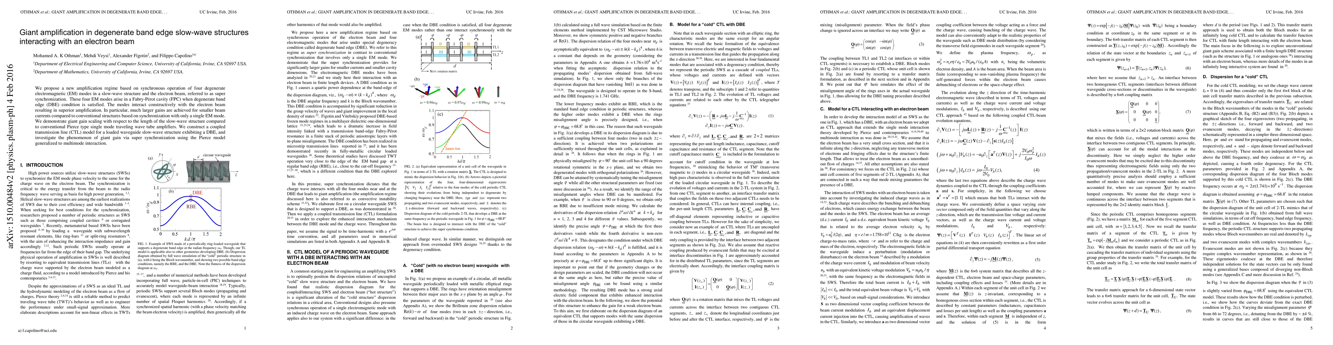We propose a new amplification regime based on synchronous operation of four degenerate electromagnetic (EM) modes in a slow-wave structure and the electron beam, referred to as super synchronization. These four EM modes arise in a Fabry-Perot cavity (FPC) when degenerate band edge (DBE) condition is satisfied. The modes interact constructively with the electron beam resulting in superior amplification. In particular, much larger gains are achieved for smaller beam currents compared to conventional structures based on synchronization with only a single EM mode. We demonstrate giant gain scaling with respect to the length of the slow-wave structure compared to conventional Pierce type single mode traveling wave tube amplifiers. We construct a coupled transmission line (CTL) model for a loaded waveguide slow-wave structure exhibiting a DBE, and investigate the phenomenon of giant gain via super synchronization using the Pierce model generalized to multimode interaction.