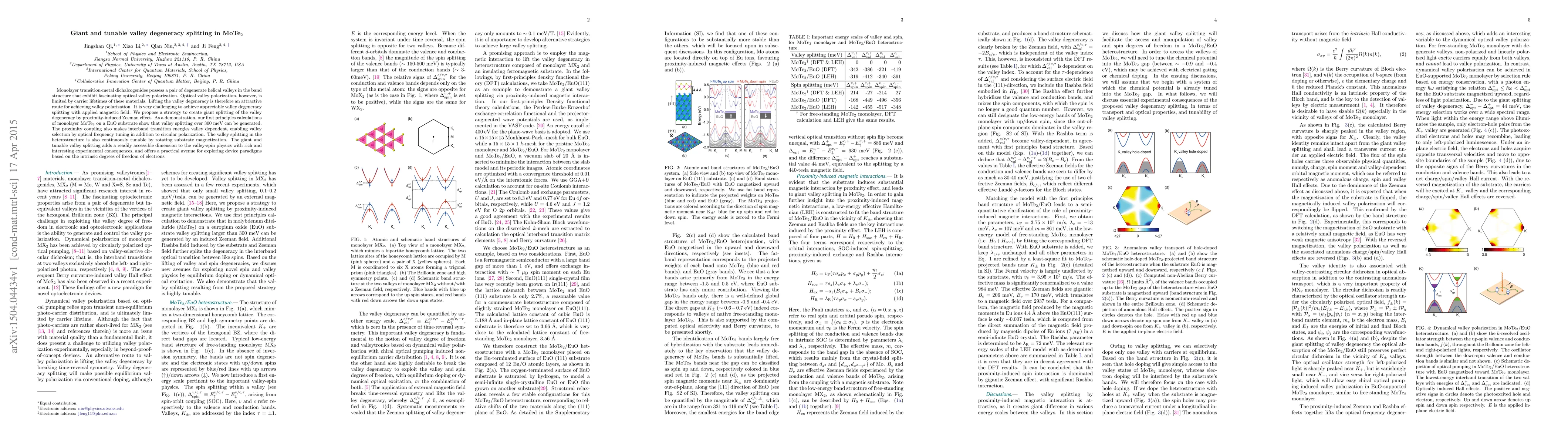 Monolayer transition-metal dichalcogenides possess a pair of degenerate helical valleys in the band structure that exhibit fascinating optical valley polarization. Optical valley polarization, however, is limited by carrier lifetimes of these materials. Lifting the valley degeneracy is therefore an attractive route for achieving valley polarization. It is very challenging to achieve appreciable valley degeneracy splitting with applied magnetic field. We propose a strategy to create giant splitting of the valley degeneracy by proximity-induced Zeeman effect. As a demonstration, our first principles calculations of monolayer MoTe$_2$ on a EuO substrate show that valley splitting over 300 meV can be generated. The proximity coupling also makes interband transition energies valley dependent, enabling valley selection by optical frequency tuning in addition to circular polarization. The valley splitting in the heterostructure is also continuously tunable by rotating substrate magnetization. The giant and tunable valley splitting adds a readily accessible dimension to the valley-spin physics with rich and interesting experimental consequences, and offers a practical avenue for exploring device paradigms based on the intrinsic degrees of freedom of electrons.