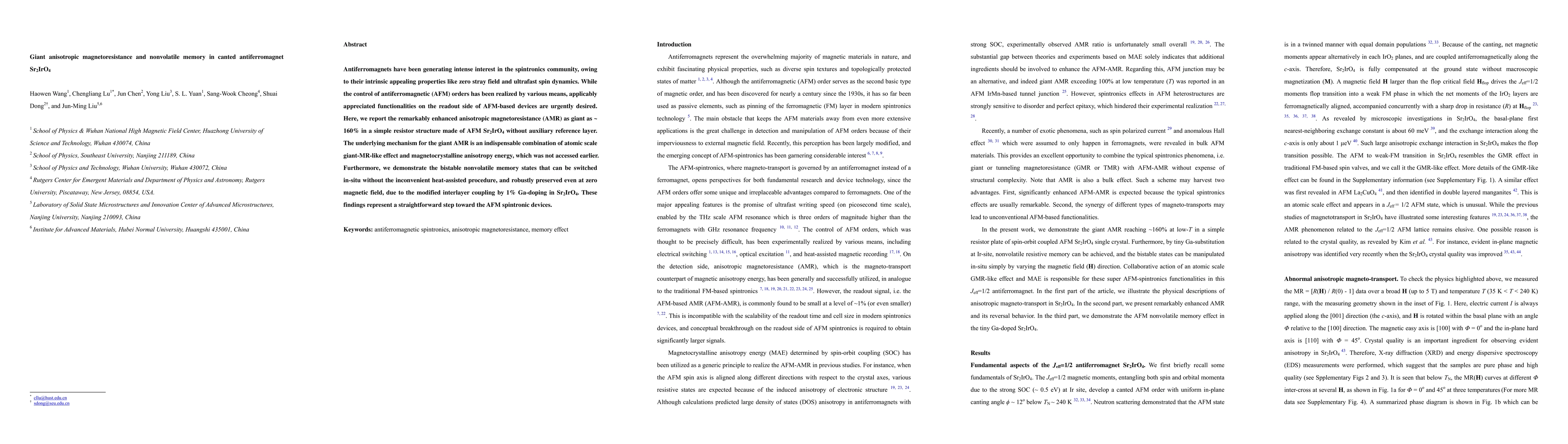 This paper reports a giant anisotropic magnetoresistance of ~160% in Sr2IrO4, driven by a combination of atomic-scale giant-MR effects and magnetocrystalline anisotropy. Additionally, it demonstrates bistable nonvolatile memory states in Ga-doped Sr2IrO4, switchable without heat assistance and preserved at zero magnetic field, advancing the development of antiferromagnetic spintronic devices.