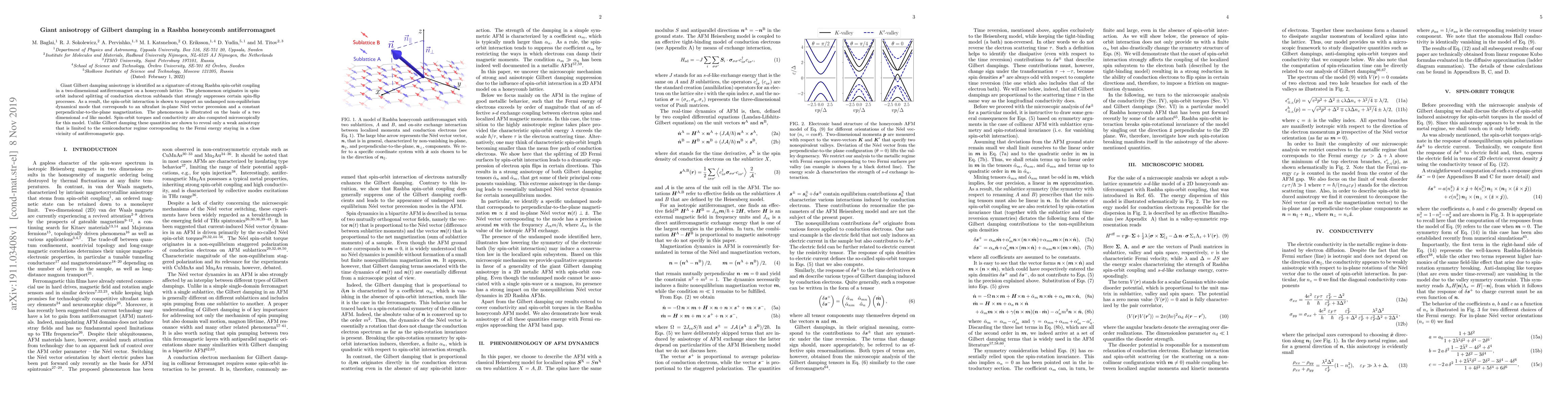 The study reveals a significant anisotropy in Gilbert damping due to strong Rashba spin-orbit coupling in a two-dimensional antiferromagnetic honeycomb lattice, leading to an undamped dynamical mode with ultrafast in-plane N\'eel vector precession. This anisotropy is attributed to spin-orbit induced splitting of conduction electron subbands, contrasting with only weak anisotropy in spin-orbit torques and conductivity.