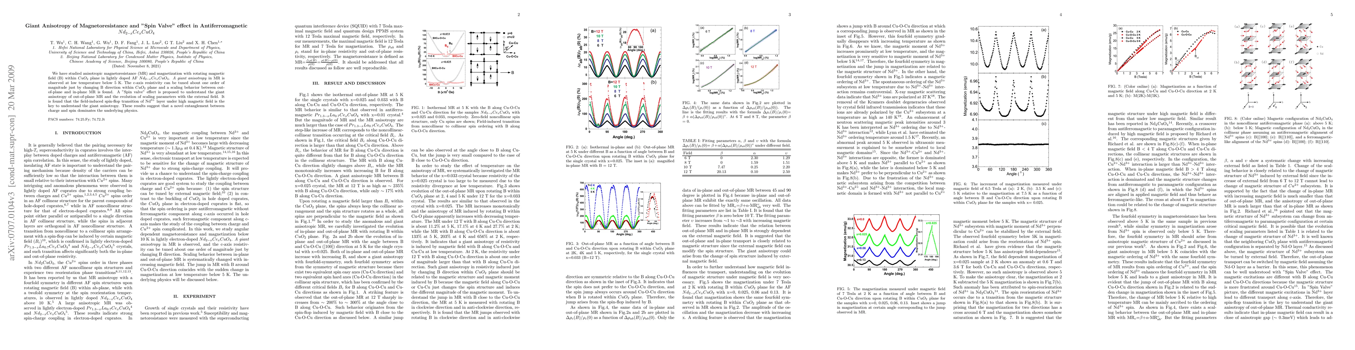 We have studied anisotropic magnetoresistance (MR) and magnetization with rotating magnetic field (B) within $CuO_2$ plane in lightly doped AF $Nd_{2-x}Ce_xCuO_{4}$. \emph{A giant anisotropy} in MR is observed at low temperature below 5 K. The c-axis resistivity can be tuned about one order of magnitude just by changing B direction within $CuO_2$ plane and a scaling behavior between out-of-plane and in-plane MR is found. A "Spin valve" effect is proposed to understand the giant anisotropy of out-of-plane MR and the evolution of scaling parameters with the external field. It is found that the field-induced spin-flop transition of Nd$^{3+}$ layer under high magnetic field is the key to understand the giant anisotropy. These results suggest that a novel entanglement between charge and spin dominates the underlying physics.