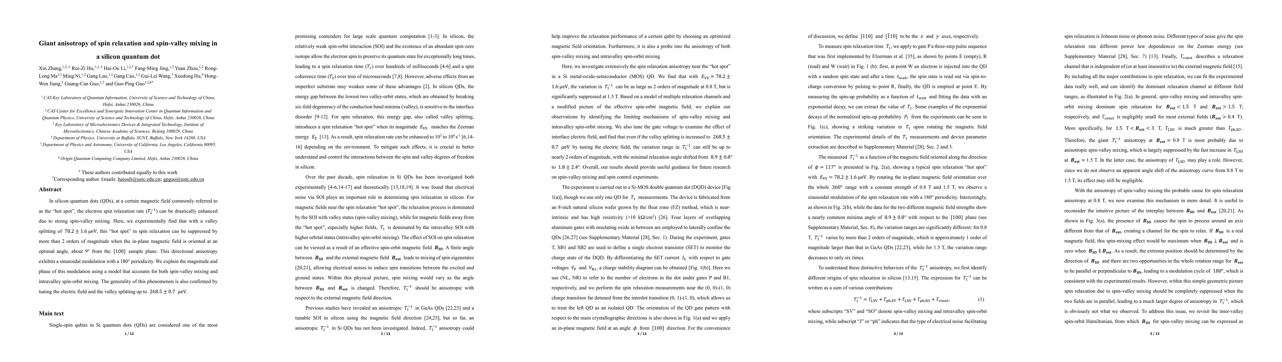This study reveals a significant anisotropy in spin relaxation in silicon quantum dots, where the "hot spot" effect is suppressed by more than two orders of magnitude when the in-plane magnetic field is oriented at a specific angle. The observed directional anisotropy is explained through a model incorporating spin-valley and intravalley spin-orbit mixing.