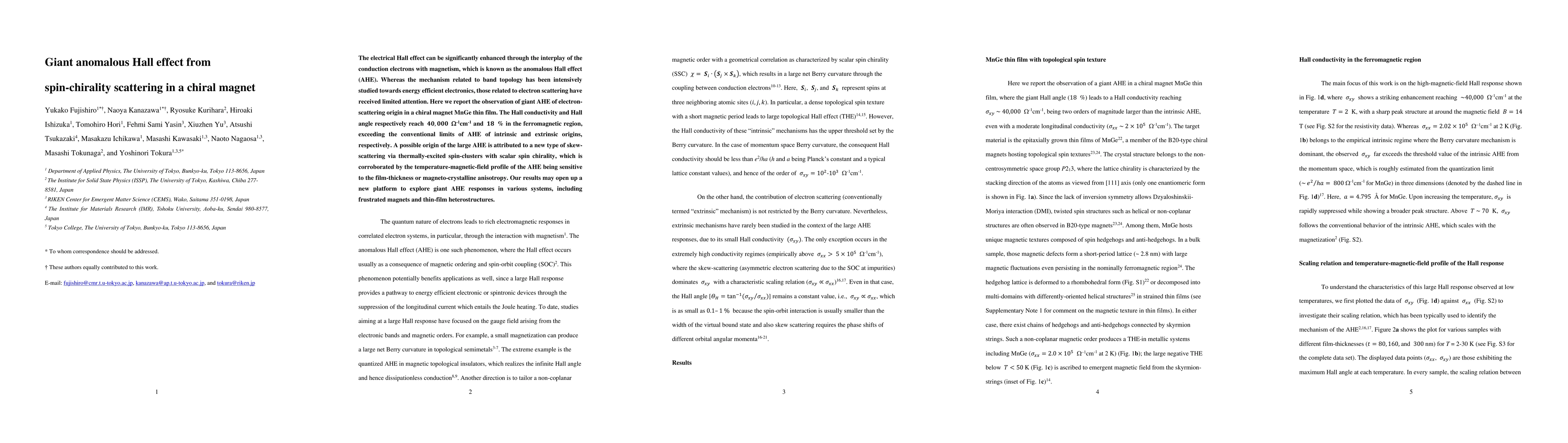 Researchers observed giant anomalous Hall effect in a chiral magnet, exceeding conventional limits, and attribute it to spin-chirality scattering via thermally-excited spin-clusters.
