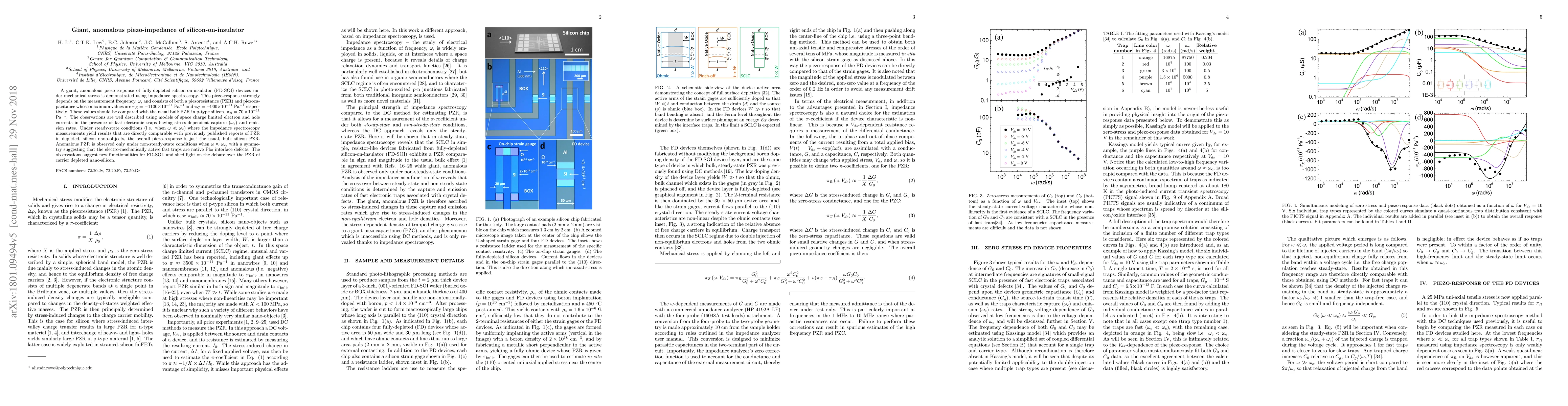 A giant, anomalous piezo-response of fully-depleted silicon-on-insulator (FD-SOI) devices under mechanical stress is demonstrated using impedance spectroscopy. This piezo-response strongly depends on the measurement frequency, $\omega$, and consists of both a piezoresistance (PZR) and piezocapacitance whose maximum values are $\pi_R = -1100 \times 10^{-11}$ Pa$^{-1}$ and $\pi_C = -900 \times 10^{-11}$ Pa$^{-1}$ respectively. These values should be compared with the usual bulk PZR in p-type silicon, $\pi_R= 70 \times 10^{-11}$ Pa$^{-1}$. The observations are well described using models of space charge limited electron and hole currents in the presence of fast electronic traps having stress-dependent capture ($\omega_c$) and emission rates. Under steady-state conditions (i.e. when $\omega \ll \omega_c$) where the impedance spectroscopy measurements yield results that are directly comparable with previously published reports of PZR in depleted, silicon nano-objects, the overall piezo-response is just the usual, bulk silicon PZR. Anomalous PZR is observed only under non-steady-state conditions when $\omega \approx \omega_c$, with a symmetry suggesting that the electro-mechanically active fast traps are native Pb$_0$ interface defects. The observations suggest new functionalities for FD-SOI, and shed light on the debate over the PZR of carrier depleted nano-silicon.