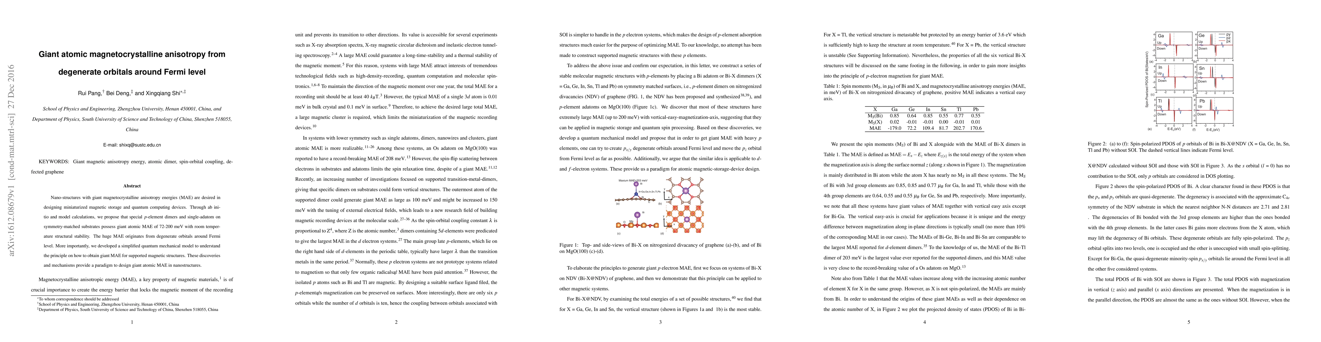 This paper proposes that specific p-element dimers and single-adatoms on symmetry-matched substrates exhibit giant atomic magnetocrystalline anisotropy energies (MAE) of 72-200 meV, originating from degenerate orbitals near the Fermi level. The findings offer a new paradigm for designing nanostructures with significant MAE for advanced magnetic storage and quantum computing applications.