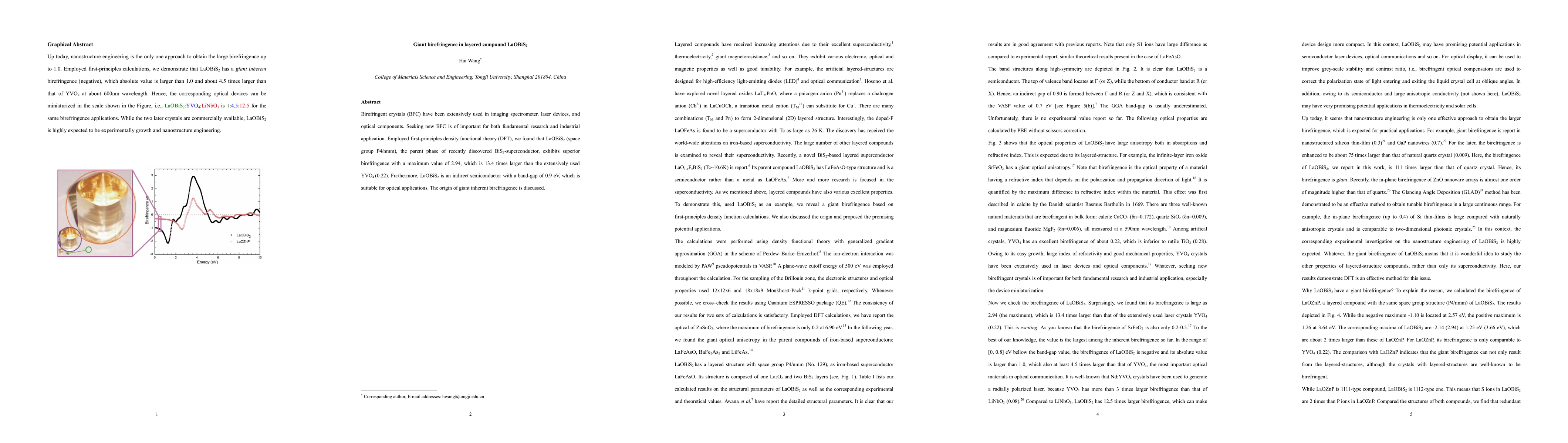 Birefringent crystals (BFC) have been extensively used in imaging spectrometer, laser devices, and optical components. Seeking new BFC is of important for both fundamental research and industrial application. Employed first-principles density functional theory (DFT), we found that LaOBiS2 (space group P4/nmm), the parent phase of recently discovered BiS2-superconductor, exhibits superior birefringence with a maximum value of 2.94, which is 13.4 times larger than the extensively used YVO4 (0.22). Furthermore, LaOBiS2 is an indirect semiconductor with a band-gap of 0.9 eV, which is suitable for optical applications. The origin of giant inherent birefringence is discussed.