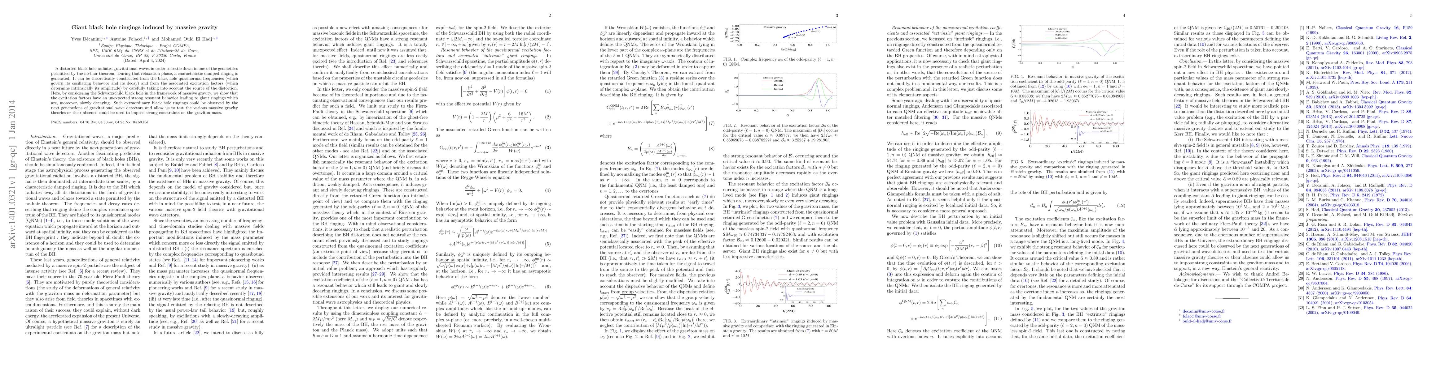 This research explores how a distorted Schwarzschild black hole in massive gravity theory emits gravitational waves, leading to unique "giant ringings" characterized by strong resonance and slow decay. These phenomena could potentially be detected by future gravitational wave observatories, offering a way to test massive gravity theories or impose constraints on graviton mass.