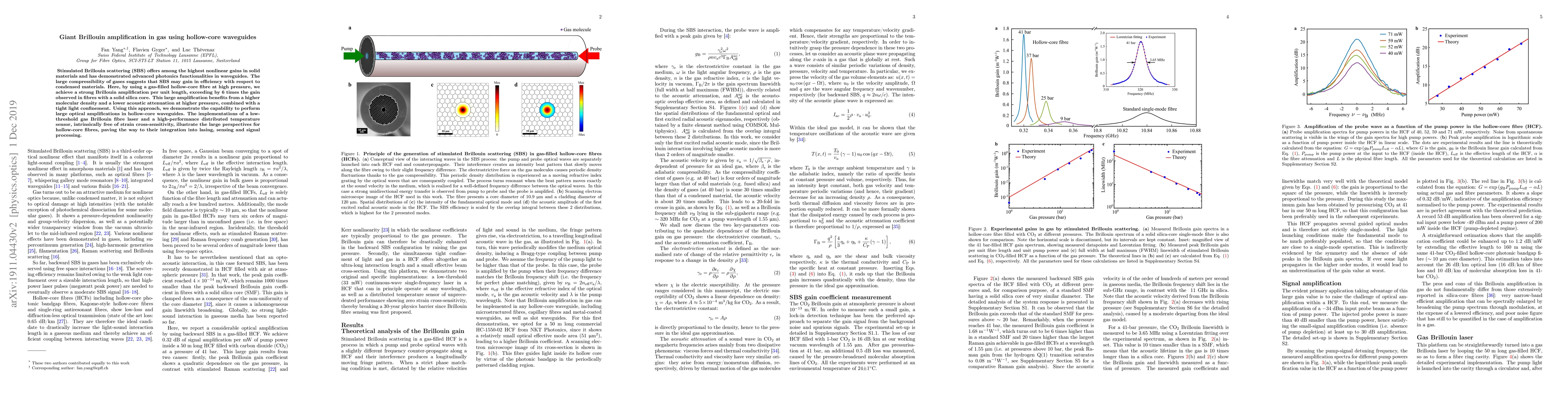 This paper demonstrates giant Brillouin amplification in gas-filled hollow-core waveguides, achieving six times higher gain than solid silica core fibres, due to higher molecular density and lower acoustic attenuation at high pressure. The study showcases potential applications in low-threshold lasers and high-performance distributed temperature sensing.