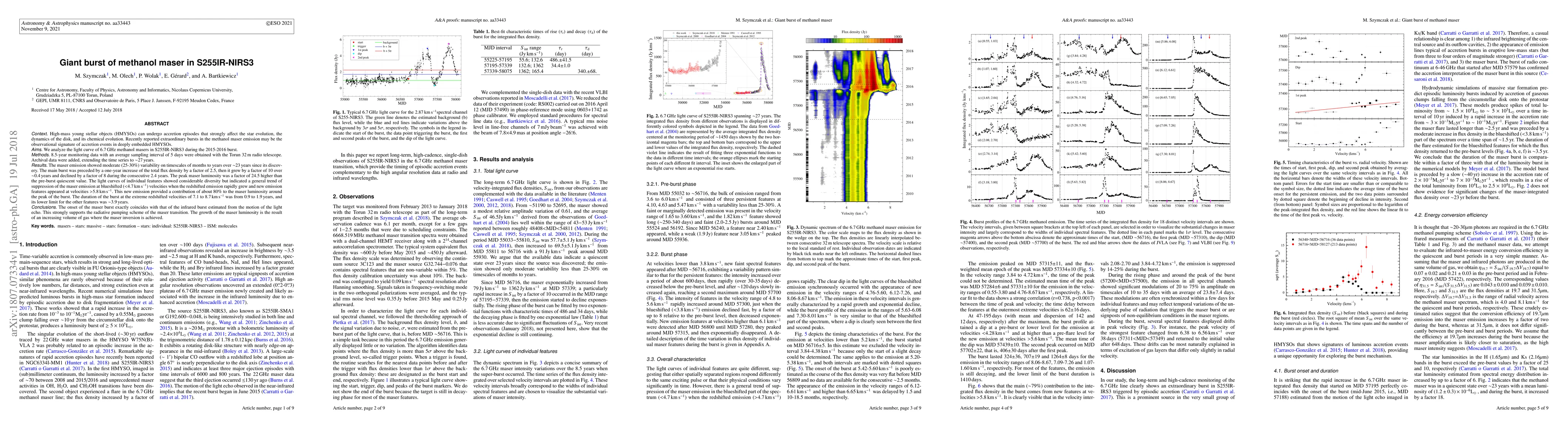 A 6.7 GHz methanol maser in S255IR-NIRS3 underwent a giant burst, with its luminosity increasing by a factor of 24.5 during the burst, suggesting radiative pumping scheme.