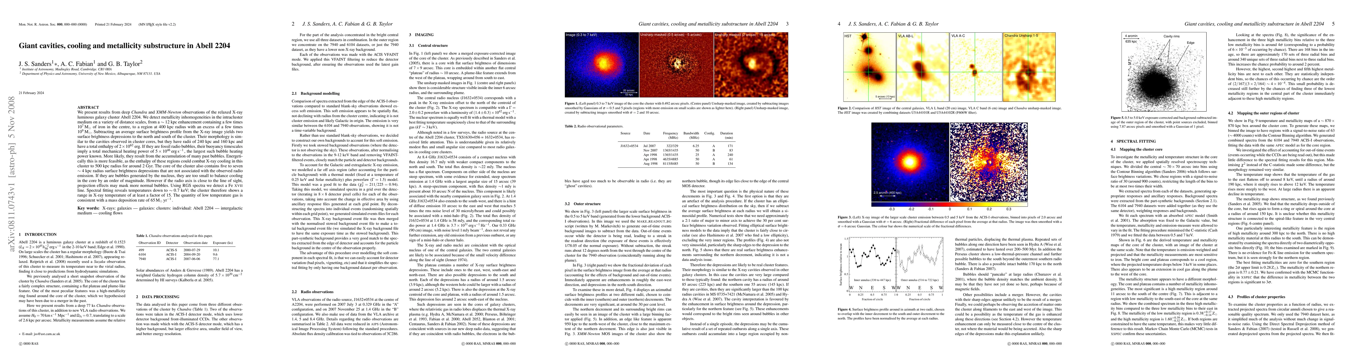 The study of Abell 2204, a massive galaxy cluster, using Chandra and XMM-Newton observations reveals large-scale metallicity inhomogeneities and giant cavities. These cavities, with radii of 240 kpc and 160 kpc, suggest a past mechanical heating power of 5x10^46 erg/s, the highest known. The cluster also exhibits a wide temperature range, down to 0.7 keV, with low-temperature gas indicating a mass deposition rate of 65 Msun/yr, pointing to ongoing cooling and feedback processes.