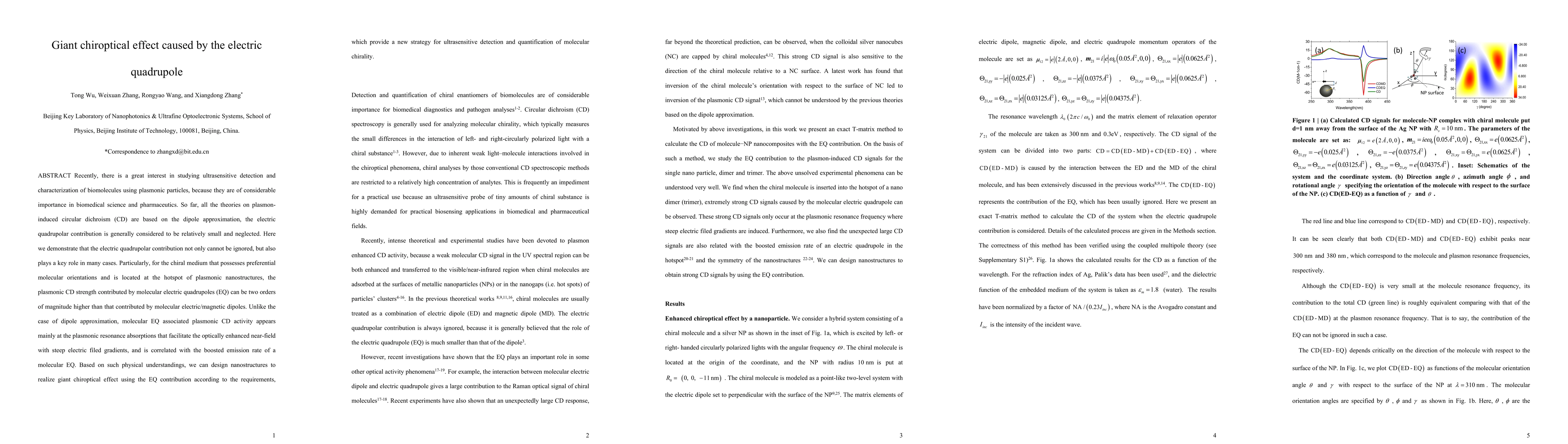 Recently, there is a great interest in studying ultrasensitive detection and characterization of biomolecules using plasmonic particles, because they are of considerable importance in biomedical science and pharmaceutics. So far, all the theories on plasmoninduced circular dichroism (CD) are based on the dipole approximation, the electric quadrupolar contribution is generally considered to be relatively small and neglected. Here we demonstrate that the electric quadrupolar contribution not only cannot be ignored, but also plays a key role in many cases. Particularly, for the chiral medium that possesses preferential molecular orientations and is located at the hotspot of plasmonic nanostructures, the plasmonic CD strength contributed by molecular electric quadrupoles (EQ) can be two orders of magnitude higher than that contributed by molecular electric/magnetic dipoles. Unlike the case of dipole approximation, molecular EQ associated plasmonic CD activity appears mainly at the plasmonic resonance absorptions that facilitate the optically enhanced near-field with steep electric filed gradients, and is correlated with the boosted emission rate of a molecular EQ. Based on such physical understandings, we can design nanostructures to realize giant chiroptical effect using the EQ contribution according to the requirements,2 which provide a new strategy for ultrasensitive detection and quantification of molecular chirality.