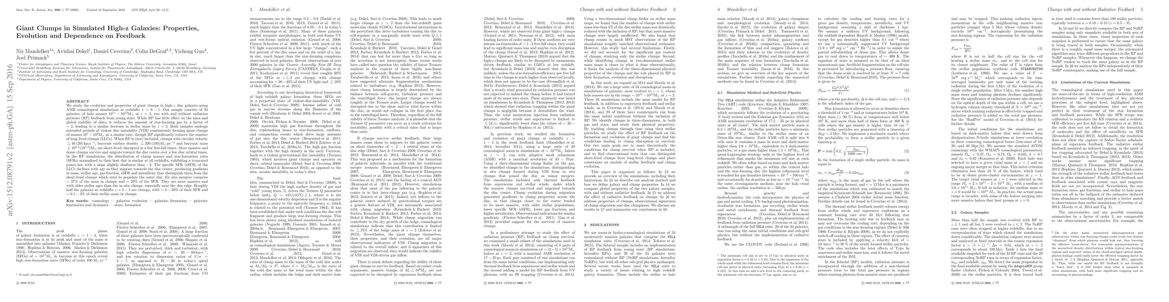 We study the evolution of giant clumps in high-z disc galaxies using AMR cosmological simulations at redshifts z=6-1. Our sample consists of 34 galaxies, of halo masses 10^{11}-10^{12}M_s at z=2, run with and without radiation pressure (RP) feedback from young stars. While RP has little effect on the sizes and global stability of discs, it reduces the amount of star-forming gas by a factor of ~2, leading to a decrease in stellar mass by a similar factor by z~2. Both samples undergo violent disc instability (VDI) and form giant clumps of masses 10^7-10^9M_s at a similar rate, though RP significantly reduces the number of long-lived clumps. When RP is (not) included, clumps with circular velocity <40(20)km/s, baryonic surface density <200(100)M_s/pc^2 and baryonic mass <10^{8.2}(10^{7.3})M_s are short-lived, disrupted in a few free-fall times. The more massive and dense clumps survive and migrate toward the disc centre over a few disc orbital times. In the RP simulations, the distribution of clump masses and star-formation rates (SFRs) normalized to their host disc is very similar at all redshifts. They exhibit a truncated power-law with a slope slightly shallower than -2. Short-lived clumps preferentially have young stellar ages, low masses, high gas fractions and specific SFRs (sSFR), and they tend to populate the outer disc. The sSFR of massive, long-lived clumps declines with age as they migrate towards the disc centre, producing gradients in mass, stellar age, gas fraction, sSFR and metallicity that distinguish them from short-lived clumps. Ex situ mergers make up ~37% of the mass in clumps and ~29% of the SFR. They are more massive and with older stellar ages than the in situ clumps, especially near the disc edge. Roughly half the galaxies at redshifts z=4-1 are clumpy over a wide range of stellar mass, with clumps accounting for ~3-30% of the SFR but ~0.1-3% of the stellar mass.